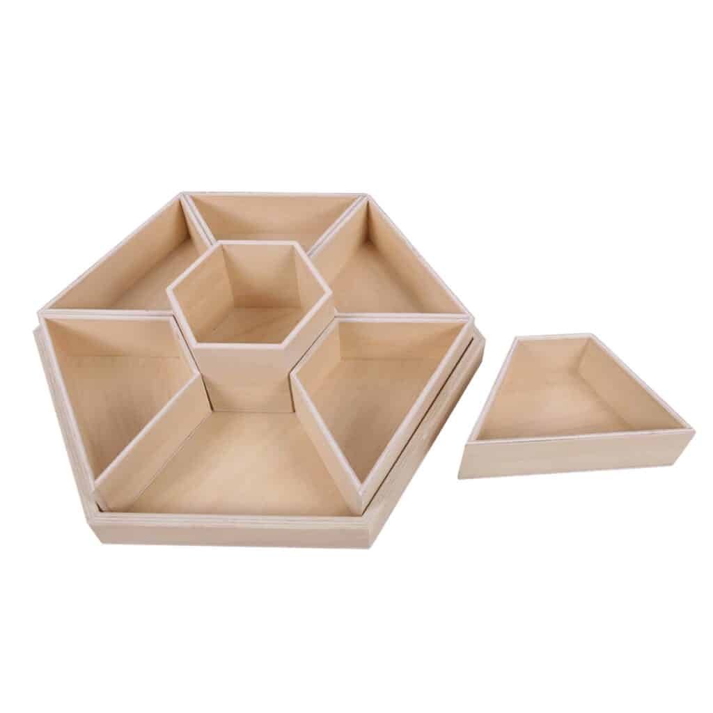 - Design: Sechseckiger Materialständer mit herausnehmbaren Fächern