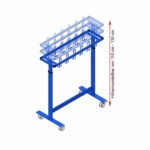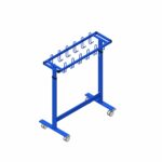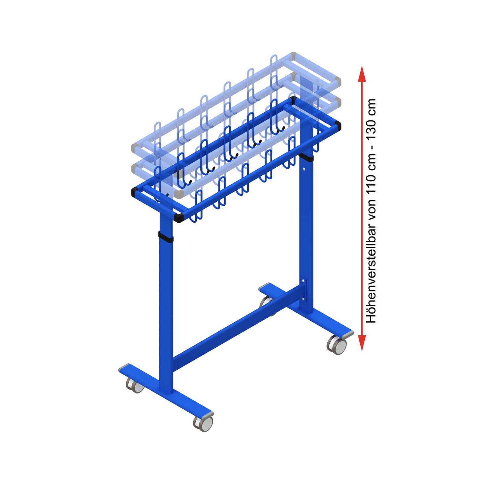Matschgarderobenständer mit Metallhaken nach innen zeigend. Höhe verstellbar 110 cm-130 cm und 4 Rollen, davon 2 feststellbar. Dadurch ist die Matschgarderobe universell einsetzbar im Krippen- und KindergartenbereichMaterial: Pulverbeschichtetes Stahlgestell, in vielen RAL-Farben lieferbar, Zweifachhaken aus Metall in der angegebenen RAL-Farbe.