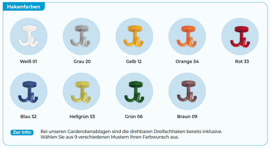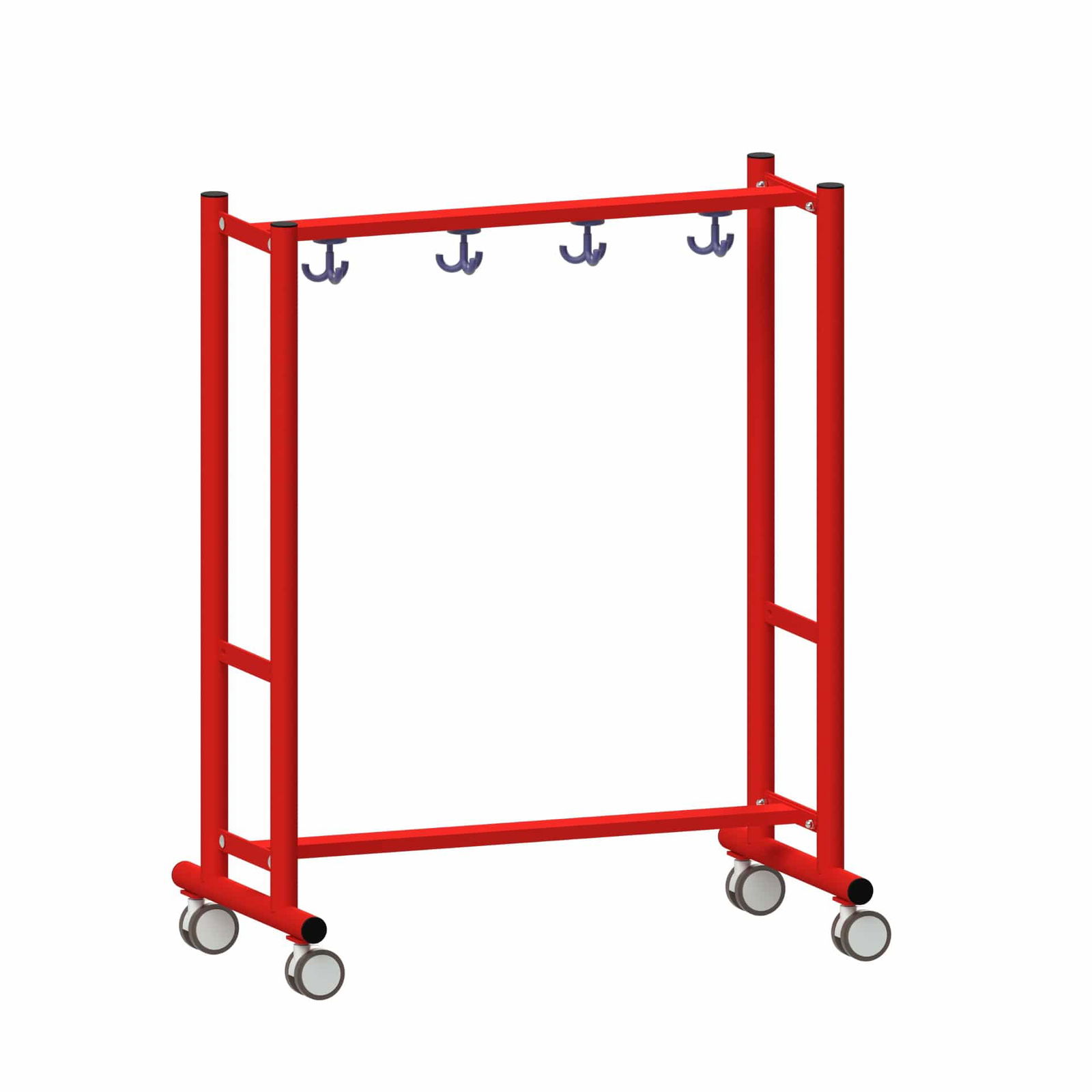 Matschgarderobenständer mit Kunststoffhaken und 4 Rollen, davon 2 feststellbar. Material: Pulverbeschichtetes Stahlgestell, in vielen RAL-Farben lieferbar, Dreifachhaken aus Kunststoff.