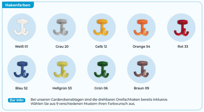 Matschgarderobenständer mit Kunststoffhaken und 4 Rollen, davon 2 feststellbar. Material: Pulverbeschichtetes Stahlgestell, in vielen RAL-Farben lieferbar, Dreifachhaken aus Kunststoff.
