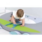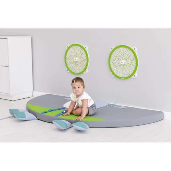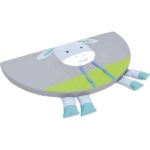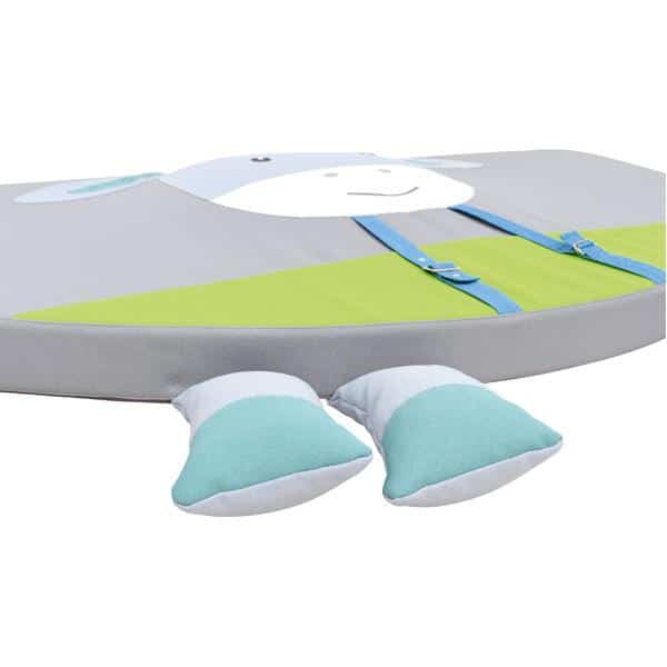 Lustige, kuschelige Matte mit Applikationen, die ein Eselchen darstellen. Kopf und Beine sind mit Silikongranulat gefüllt. Grundform der Matte ist ein Halbkreis.