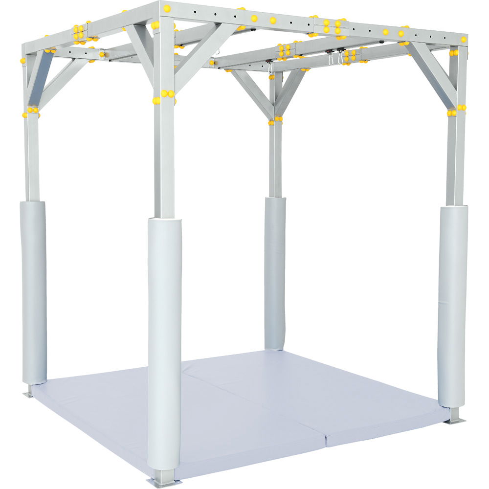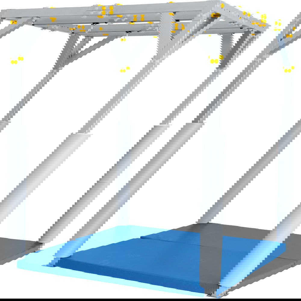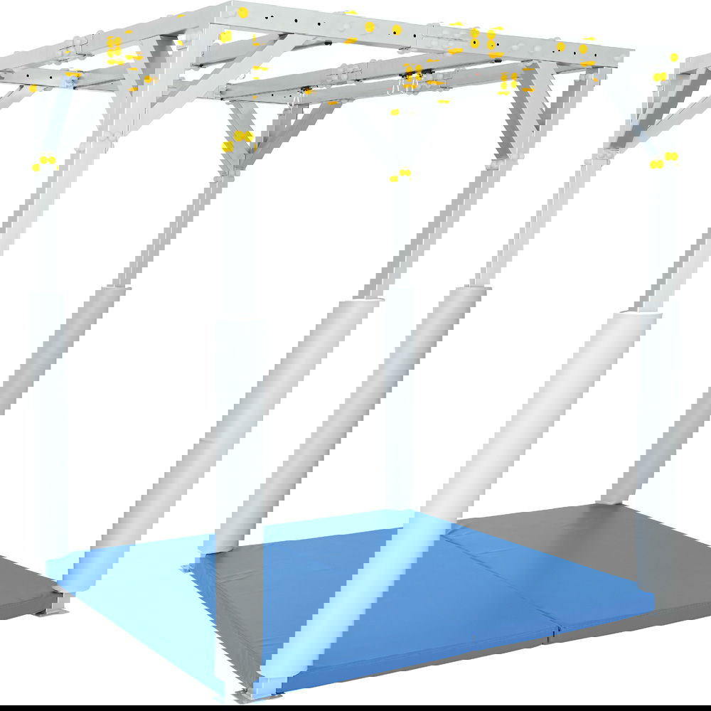 Die Konstruktion dieses zweiteiligen Mattensets ist präzise auf die Architektur des SI-Therapiezentrums abgestimmt. Dank der passgenauen Aussparungen für die Pfosten umschließt das Set das Gerüst lückenlos und verhindert gefährliche Zwischenräume. Die beiden großzügigen Mattenelemente werden durch ein starkes Klettsystem sicher und rutschfest miteinander verbunden. So entsteht eine durchgehende, einheitliche Schutzfläche, die auch bei intensiver dynamischer Belastung fest an ihrem Platz bleibt.
