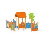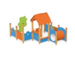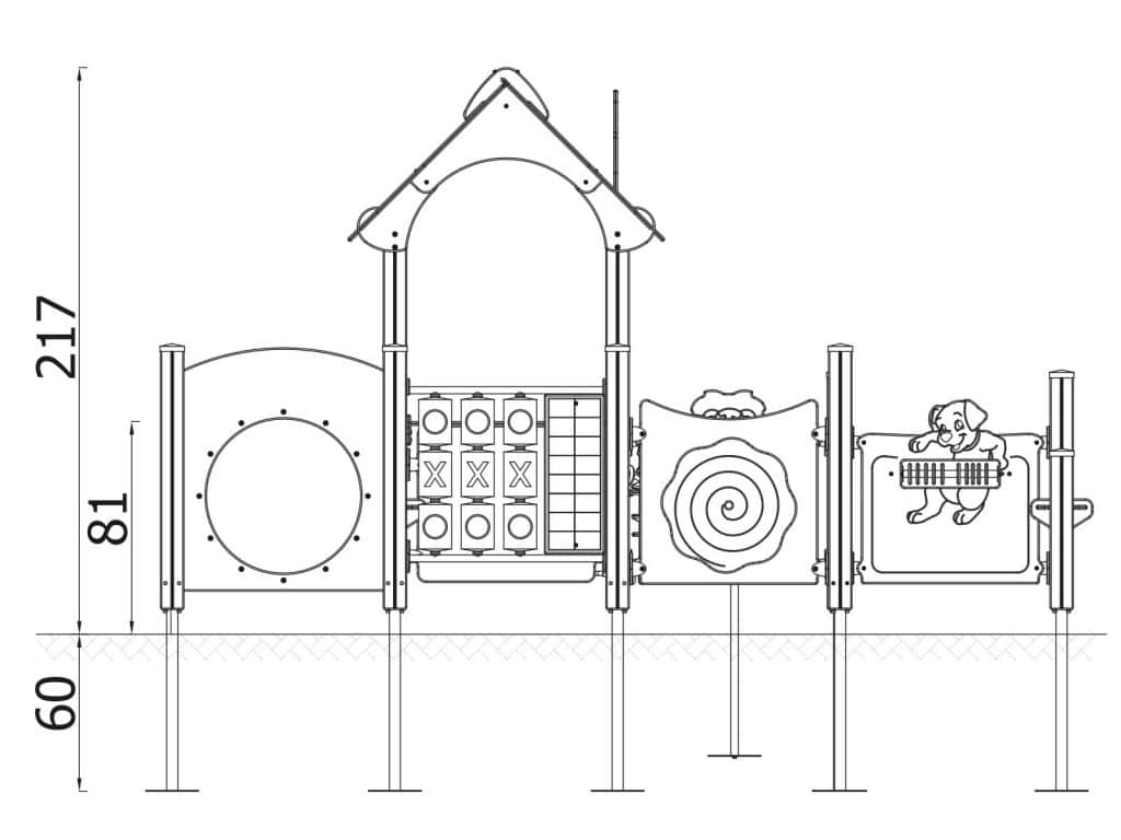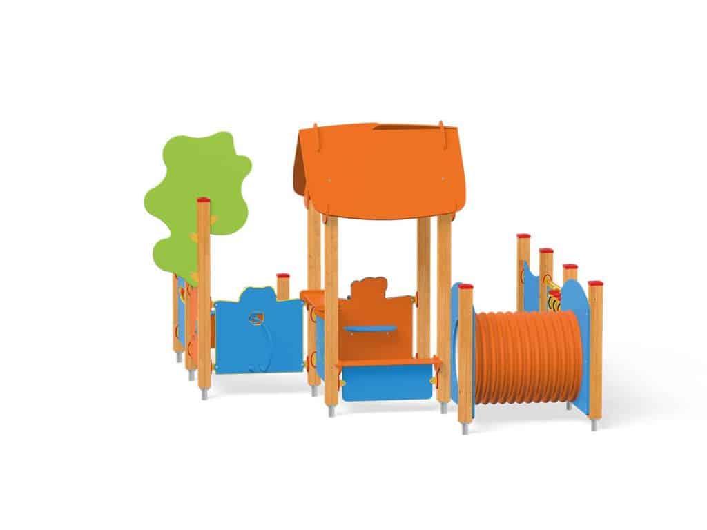 - Material: Die Tragpfosten sind quadratisch und haben einen Querschnitt von 9×9 cm. Sie bestehen aus Brettschichtholz und werden 10 cm über dem Boden mit Metallankern befestigt. Rutschfeste Plattformen. Dächer, Sicherheitselemente und Paneele werden aus HDPE-Platten (High Durable Polyethylen) mit Musterzuschnitten hergestellt. Gleitfläche aus säurebeständigem Edelstahlblech. Alle Fittings und Anschlüsse sind witterungs- und UV-beständig. Holzelemente werden geölt oder mit einer Farblasur überzogen. Stahlelemente sind durch Zinkschicht und Pulverlackierung gegen Korrosion geschützt.