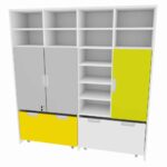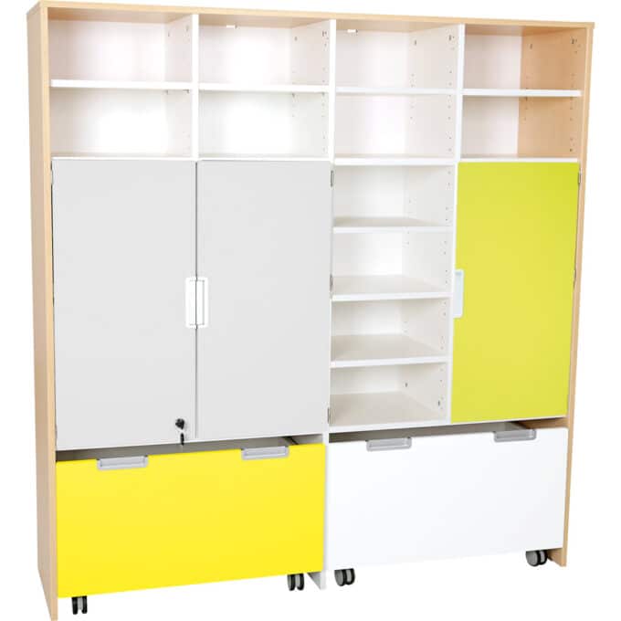Der Mehrfunktionen-Schrank Quadro XL bietet Ihnen unzählige Möglichkeiten zur individuellen Gestaltung. Ergänzen Sie den Schrank mit zusätzlichen Einlegeböden und verschiedenen Türen, um eine maßgeschneiderte Aufbewahrungslösung zu schaffen. Die zwei breiten Rollbehälter in Weiß und Gelb bieten reichlich Platz für Spielsachen, Materialien und vieles mehr, sodass alles ordentlich und griffbereit verstaut ist.