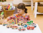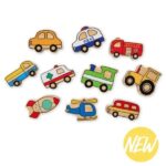 Die Bilder auf den Fahrzeugen werden im ungiftigen Thermotransfer-Verfahren auf beiden Seiten aufgedruckt und mit einem matten Klarlack versiegelt, um eine lang anhaltende Haltbarkeit zu gewährleisten. Das Set besteht aus 10 Teilen und besteht aus FSC-zertifiziertem neuseeländischem Kiefernholz. Das kleinste Stück ist 7,6 cm breit, das größte Stück ist 12,8 cm breit. Die Höhe variiert zwischen 6,9 cm und 13,2 cm. Das Spielzeug ist für Kinder ab 1 Jahr und älter geeignet.