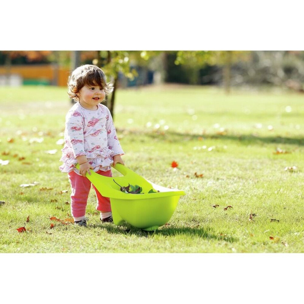 Wir legen großen Wert auf nachhaltige und sichere Materialien, die den ständigen Belastungen des Alltags problemlos standhalten. Die Schubkarre wird in Europa unter strengen Qualitätsvorgaben hergestellt und besteht aus dickem, widerstandsfähigem Polyethylen, das zu 100 Prozent recycelbar ist. Die besonders robusten Räder meistern mühelos verschiedene Untergründe, von weichen Teppichböden über glattes Parkett bis hin zu holprigen Rasenflächen oder Sandkästen. Dank der cleveren Formgebung lassen sich mehrere Schubkarren nach dem Spielen bequem und platzsparend ineinander stapeln. Selbstverständlich erfüllt dieses hochwertige Spielzeug die strengen Vorgaben der europäischen Spielzeugnormen EN 71 (Teile 1, 2 und 3).