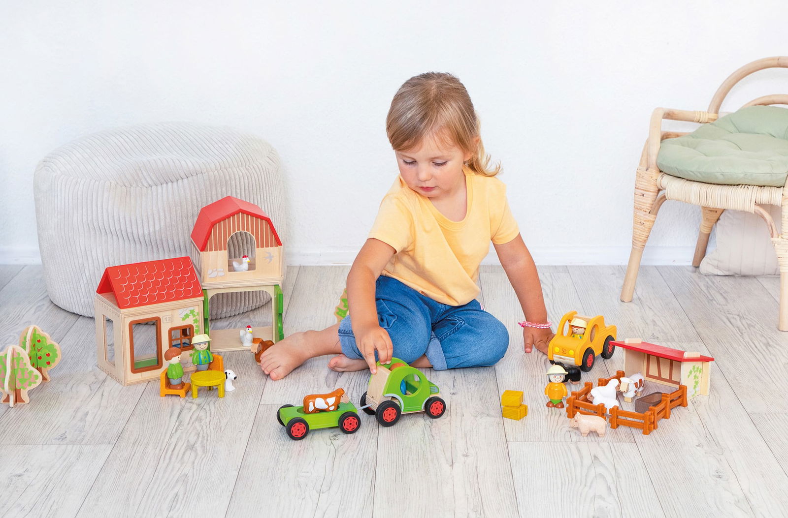 - Bühne frei für ländliche Szenen: Mit beweglichen Figuren und Fahrzeugen mit Rädern können Kinder das bäuerliche Leben spielerisch nachstellen.