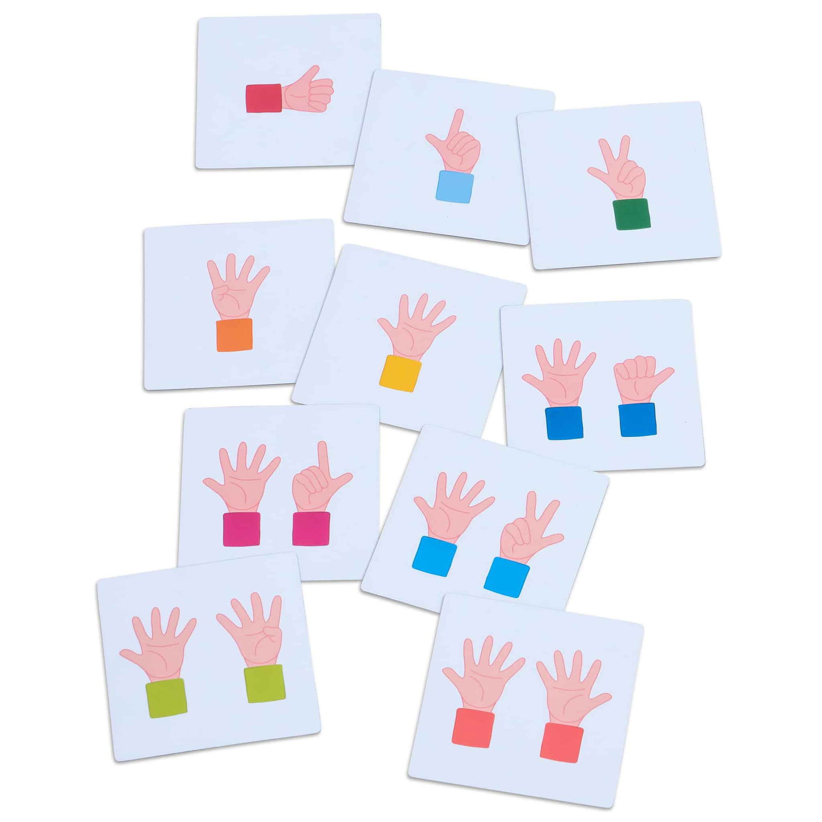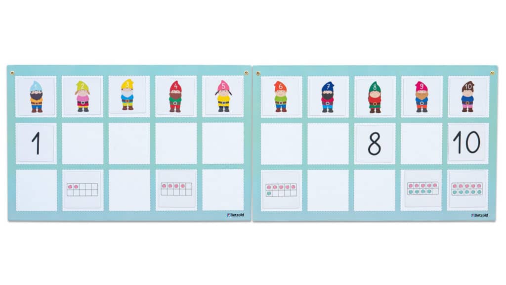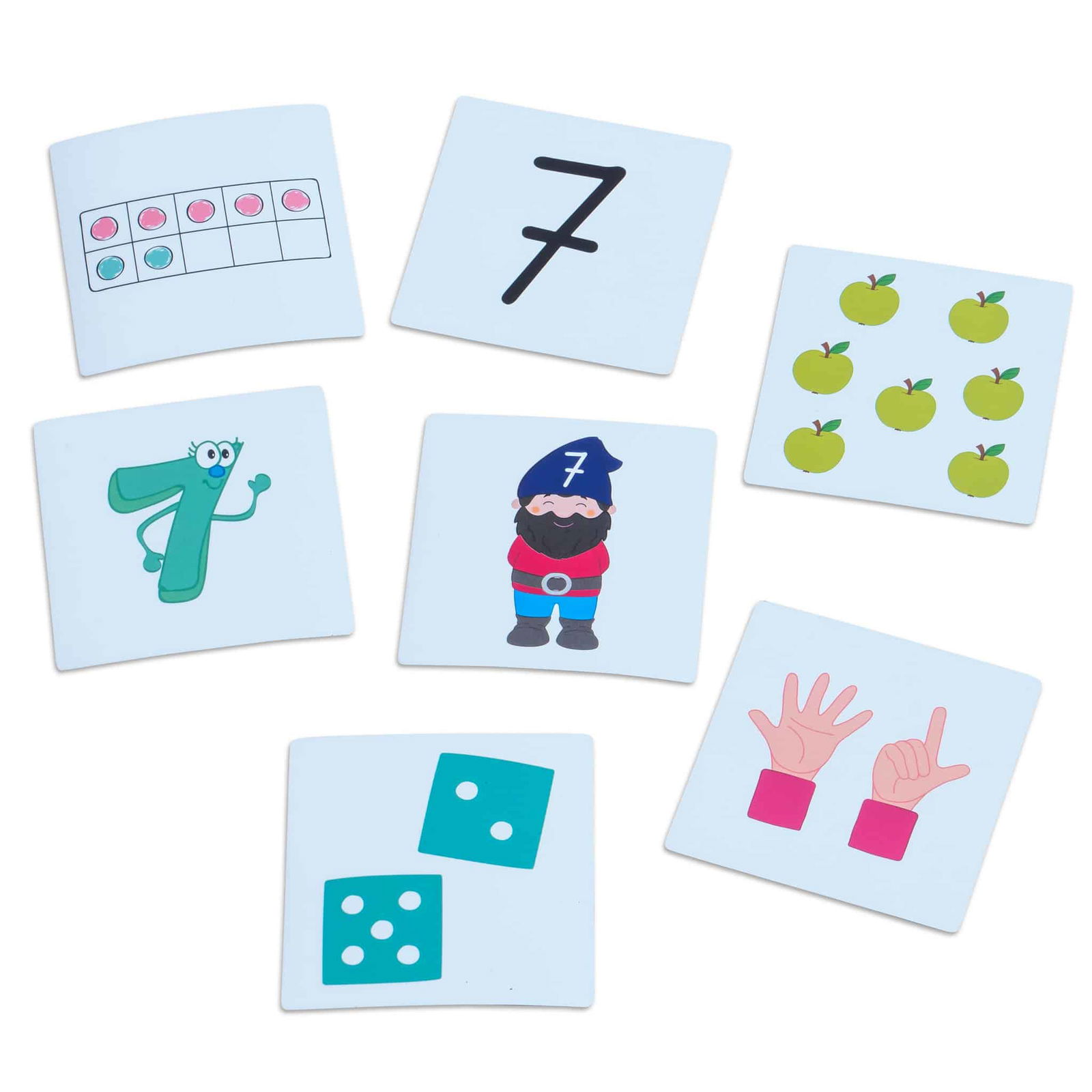 Das Set enthält 10 Zahlenkärtchen in schwarz-weiß sowie eine farbenfrohe Variante, 10 Kärtchen mit Zwergen, 10 Kärtchen mit Mengenbildern und 10 Kärtchen mit Fingerzahlen. Durch das Vergleichen, Anordnen und Ergänzen von Zahlen wird die mathematische Wahrnehmung gefördert und Kinder können grundlegende Rechenoperationen, wie Addition und Subtraktion, erlernen.