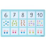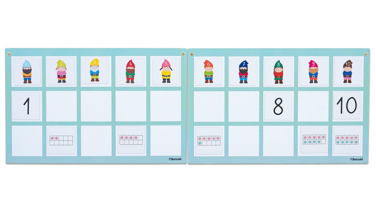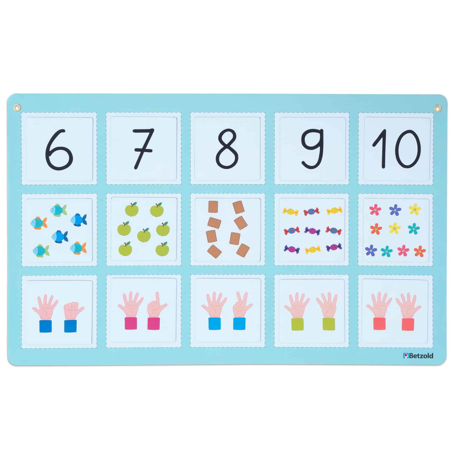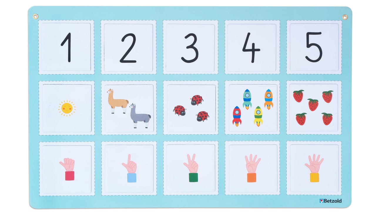Die Betzold Mengen und Zahlen Tafeln sind aus stabil beschichtetem Karton gefertigt und mit praktischen Ösen ausgestattet, sodass sie leicht an der Wand befestigt werden können. Jede Tafel hat Platz für 5 Zahlen, die magnetisch an den Tafeln haften. So haben Kinder die Möglichkeit, die magnetischen Karten einfach zu platzieren und die Aufgaben interaktiv zu lösen.