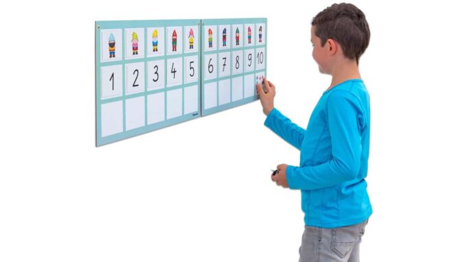 Die Betzold Mengen und Zahlen Tafeln sind aus stabil beschichtetem Karton gefertigt und mit praktischen Ösen ausgestattet, sodass sie leicht an der Wand befestigt werden können. Jede Tafel hat Platz für 5 Zahlen, die magnetisch an den Tafeln haften. So haben Kinder die Möglichkeit, die magnetischen Karten einfach zu platzieren und die Aufgaben interaktiv zu lösen.