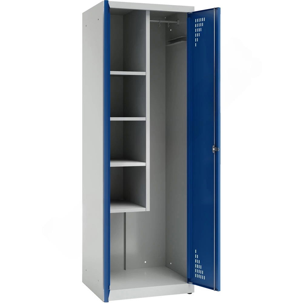 Der Innenraum ist clever in zwei Funktionsbereiche unterteilt. Auf der linken Seite bieten vier stabile Böden reichlich Platz für Putzmittel, Handtücher, Werkzeuge oder Aktenordner. Die rechte Seite ist mit einer Kleiderstange ausgestattet, ideal für Arbeitsjacken oder Schürzen. Zusätzlich befindet sich dort eine praktische Halterung für Besen, Wischer oder andere lange Reinigungsgeräte. So haben Sie alles griffbereit an einem Ort. - Höchste Sicherheit durch 3-Punkt-Verriegelung