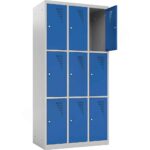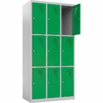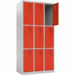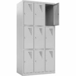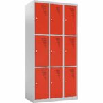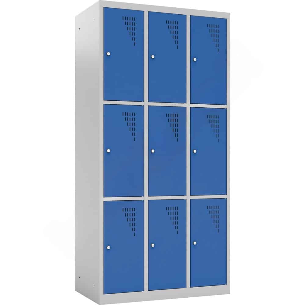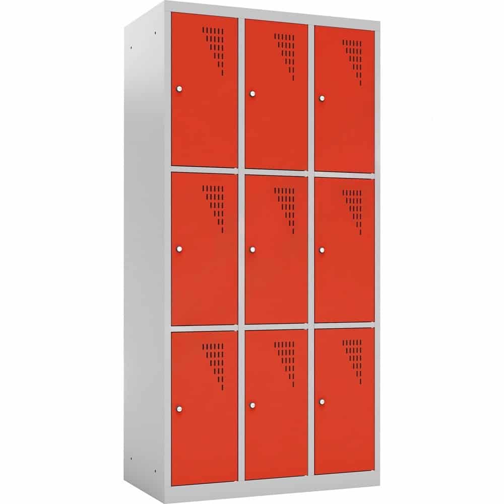Ob im Klassenzimmer, im Lehrerzimmer, in der Universität oder im Pausenraum eines Unternehmens: Persönlicher Stauraum ist oft Mangelware, aber dringend notwendig. Der Metallspind mit 9 Fächern (Höhe 180 cm) ist die ideale Lösung, um vielen Nutzern auf kleiner Stellfläche einen eigenen, sicheren Bereich zu bieten. Mit einer Breite von knapp 90 cm stellt dieser Schrank neun geräumige Einzelabteile zur Verfügung, in denen Taschen, Bücher, Helme oder persönliche Wertsachen sicher verwahrt werden können.