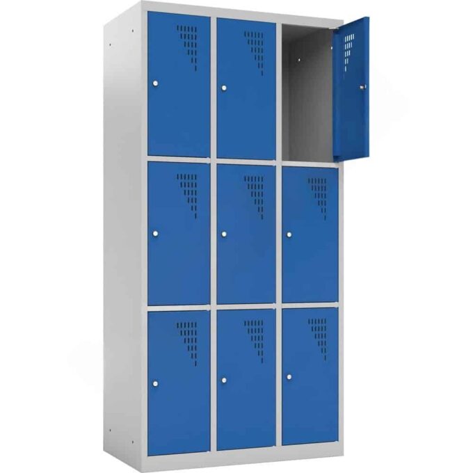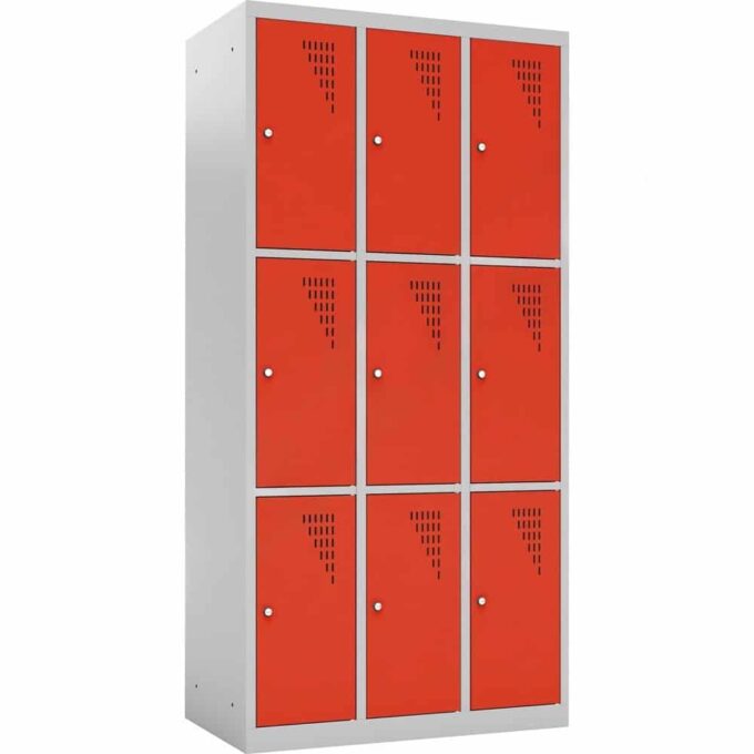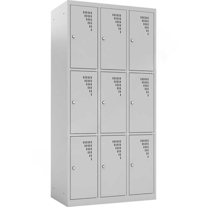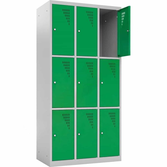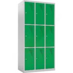 Neun Personen auf weniger als einem halben Quadratmeter Grundfläche unterzubringen, ist eine logistische Meisterleistung. Dieser Spind macht es möglich. Durch die Aufteilung in drei Spalten und drei Ebenen entsteht ein hocheffizientes Stauraumsystem, das ideal für Orte ist, an denen viele Menschen zusammenkommen, aber wenig Platz für große Garderobenschränke vorhanden ist.