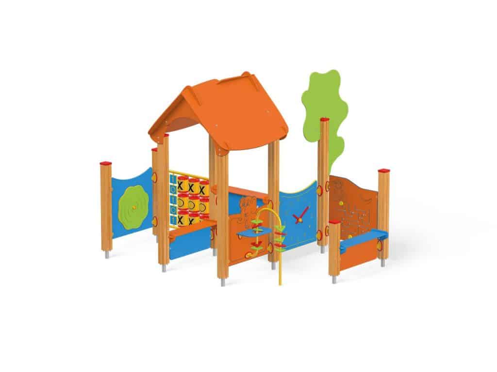 - Material: Die Tragpfosten sind quadratisch und haben einen Querschnitt von 9×9 cm. Sie bestehen aus Brettschichtholz und werden 10 cm über dem Boden mit Metallankern befestigt. Rutschfeste Plattformen. Dächer, Sicherheitselemente und Paneele werden aus HDPE-Platten (High Durable Polyethylen) mit Musterzuschnitten hergestellt. Gleitfläche aus säurebeständigem Edelstahlblech. Alle Fittings und Anschlüsse sind witterungs- und UV-beständig. Holzelemente werden geölt oder mit einer Farblasur überzogen. Stahlelemente werden mit Zinkgrundierung und Pulverlackierung gegen Korrosion geschützt.
