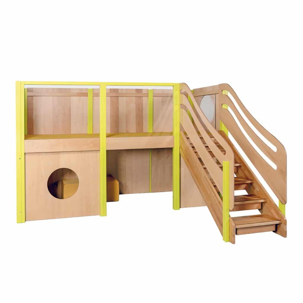 - Passend zu den Verhältnissen in Ihrem Gruppenraum, dem zur Verfügung stehenden Platz und der Größe der Kinder (Podesthöhe), erfolgt die Auswahl der passenden Spielburg.