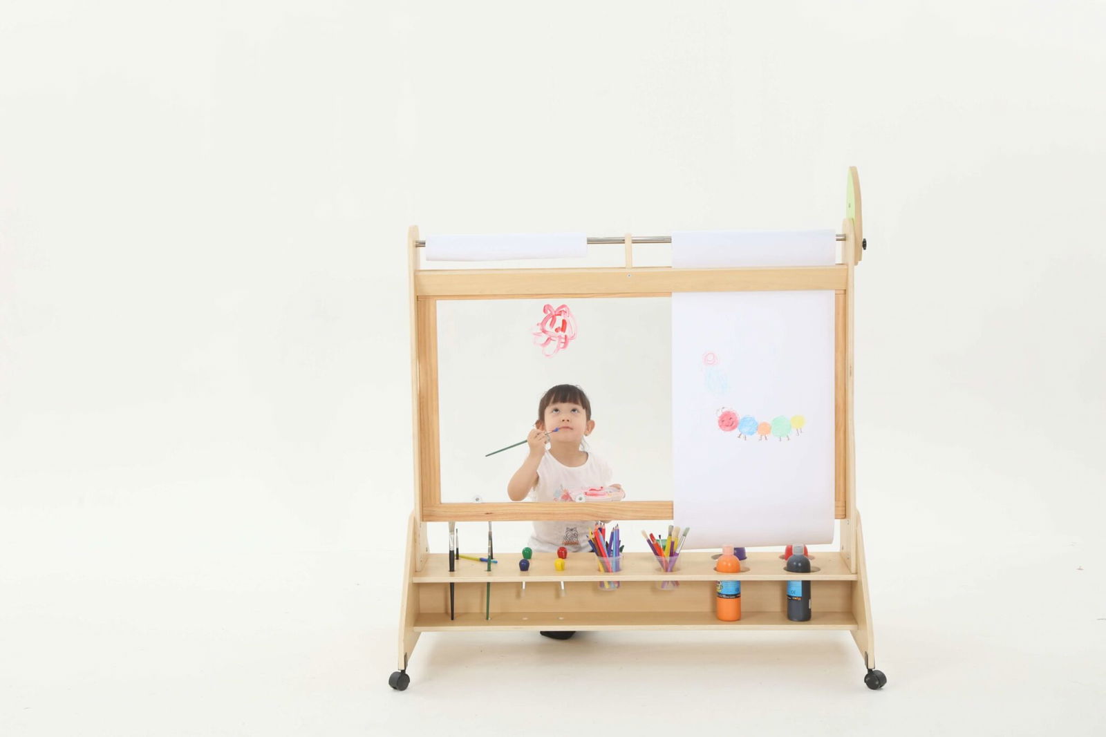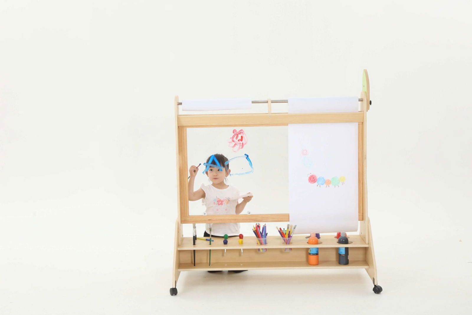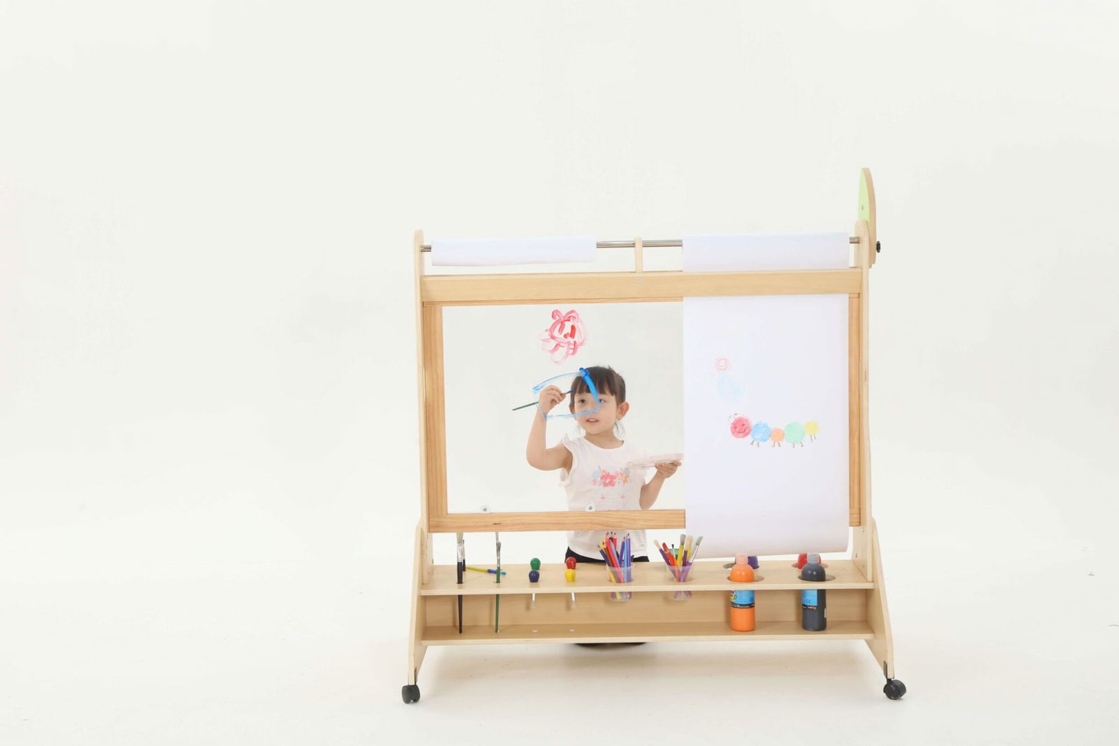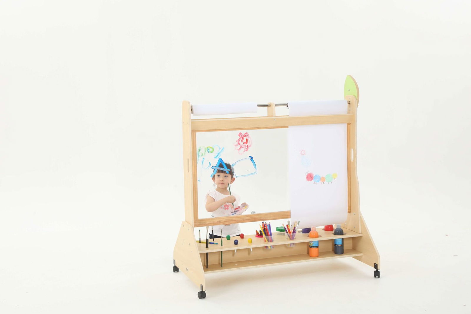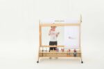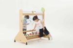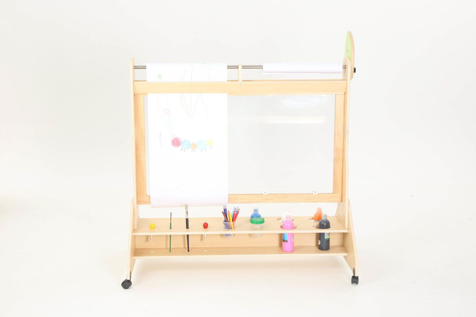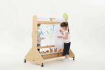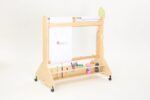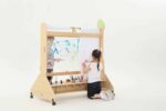 Die Mobile Maltafel überzeugt durch ihre durchdachte Bauweise und die praktischen Funktionen. Mit Maßen von 123 x 70 x 130 cm bietet sie ausreichend Platz für Malutensilien und die kreative Entfaltung. Die Maltafel ist mit drehbaren Rollen ausgestattet, die mit Feststellbremsen versehen sind, sodass sie sicher an Ort und Stelle bleibt, während die Kinder eifrig arbeiten.