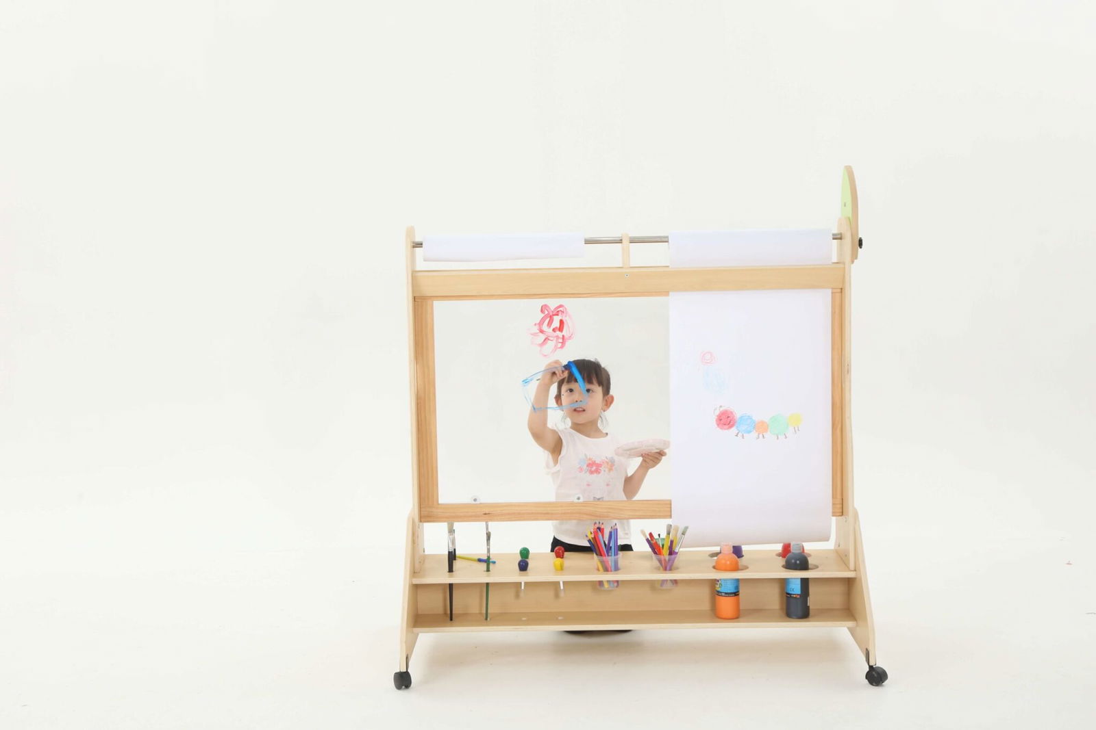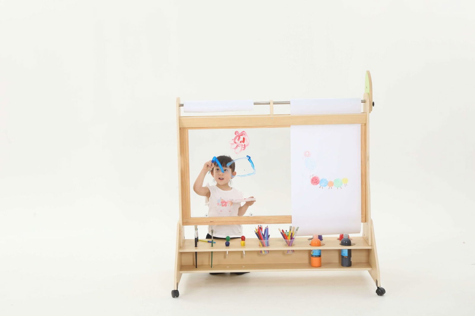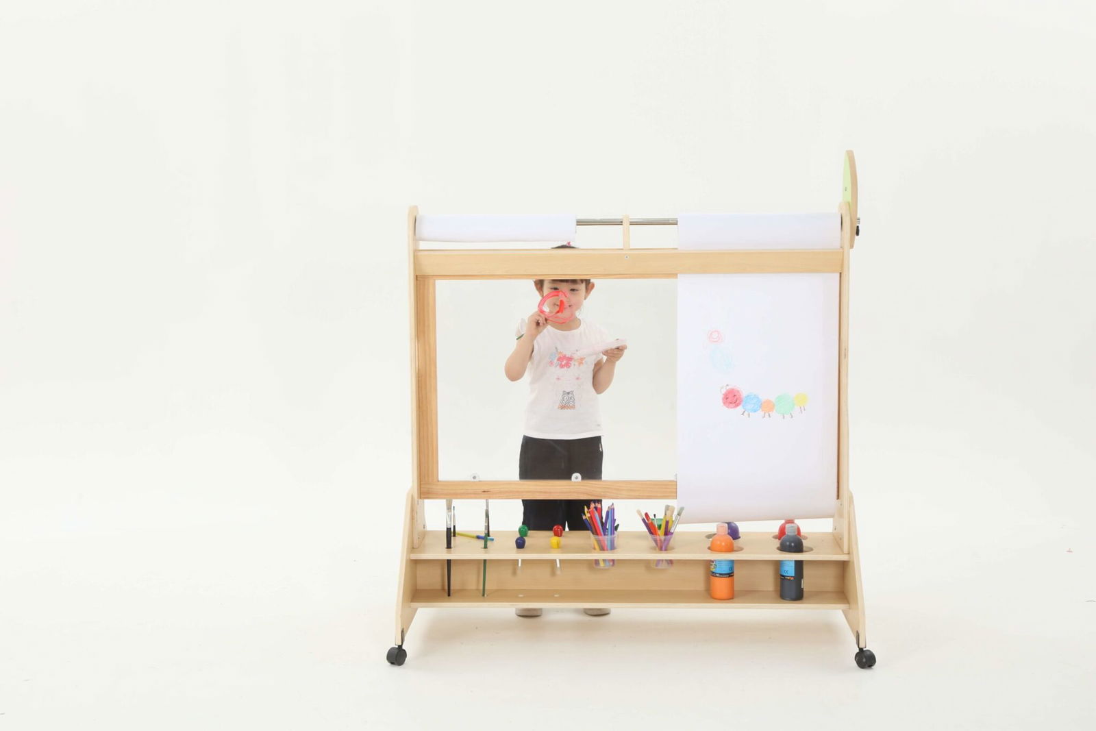 Die Mobile Maltafel ist nicht nur eine Tafel, sondern auch ein kreativer Raum, in dem Kinder mit verschiedenen Maltechniken experimentieren können. Sie ist kompatibel mit Papierrollen von 50 cm x 25 m, sodass die Kinder mühelos neue Kunstwerke schaffen können, ohne dass der Spaß je endet. Die transparente Fläche ermöglicht zudem ein aufregendes Spielen mit verschiedenen Farben und Materialien, was die Kreativität weiter anregt.