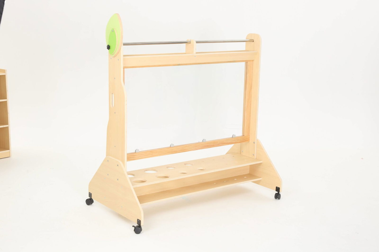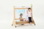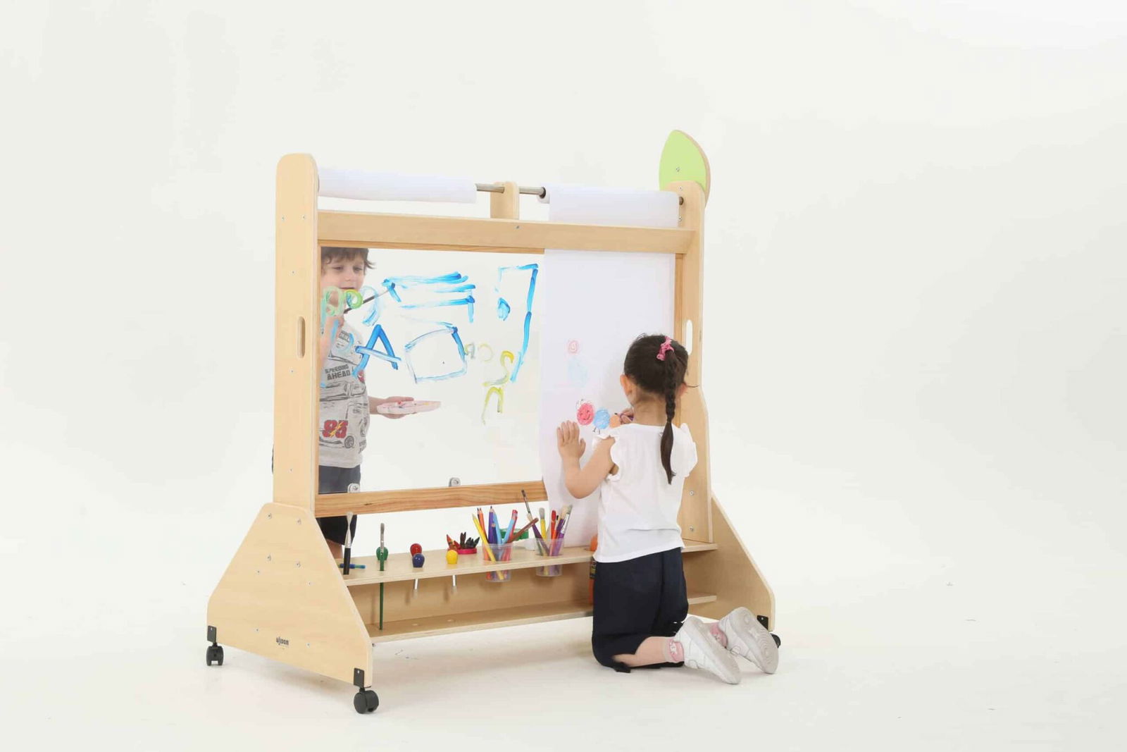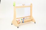 Hergestellt aus Pappel-Multiplex mit Melaminbeschichtung, Polycarbonat, Kunststoff und Stahl, garantiert unsere Mobile Maltafel nicht nur Stabilität, sondern auch eine lange Lebensdauer im täglichen Gebrauch. Die Materialien sind so ausgewählt, dass sie den Herausforderungen des Spielalltags standhalten und gleichzeitig eine sichere Umgebung für das künstlerische Schaffen bieten.