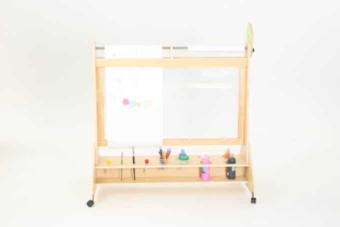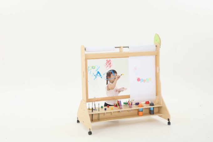 Die Mobile Maltafel überzeugt durch ihre durchdachte Bauweise und die praktischen Funktionen. Mit Maßen von 123 x 70 x 130 cm bietet sie ausreichend Platz für Malutensilien und die kreative Entfaltung. Die Maltafel ist mit drehbaren Rollen ausgestattet, die mit Feststellbremsen versehen sind, sodass sie sicher an Ort und Stelle bleibt, während die Kinder eifrig arbeiten.