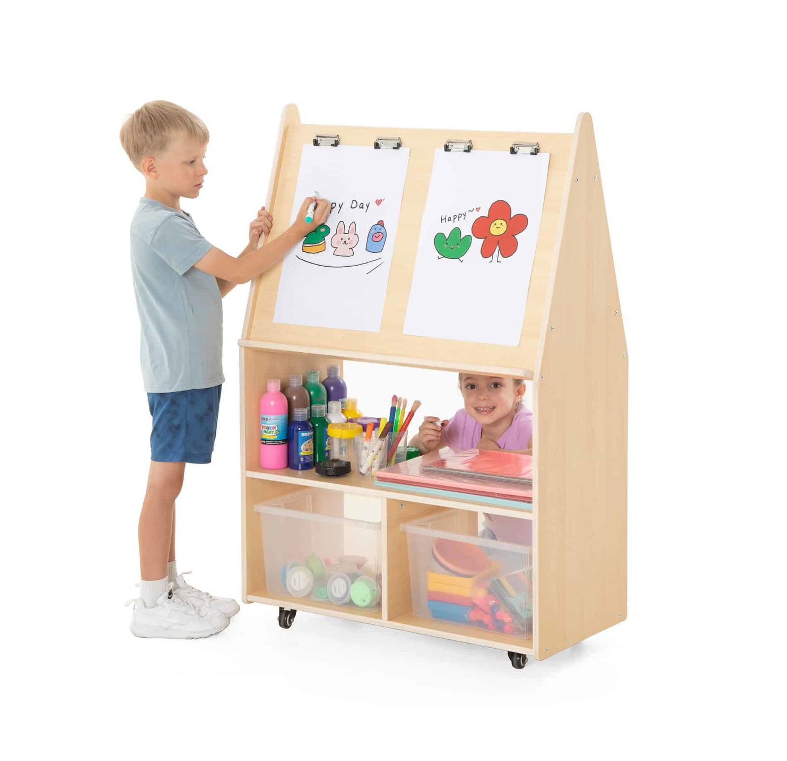 Dank der doppelseitigen Konstruktion können bis zu vier Kinder gleichzeitig ihre Kreativität ausleben. Stellen Sie sich die bunten Kunstwerke vor, die hier entstehen, während die Kinder die Möglichkeit haben, sich gegenseitig zu inspirieren und ihre Fantasie zu entfalten. Die mobile Staffelei verwandelt das Malen in ein soziales Erlebnis voller Spaß und Interaktion!