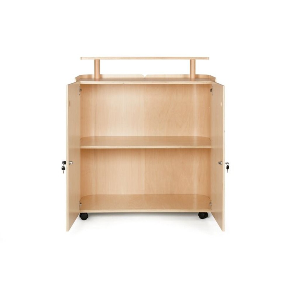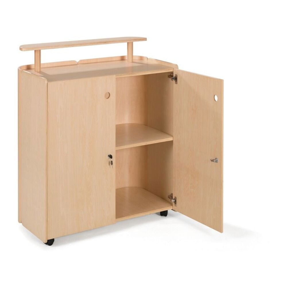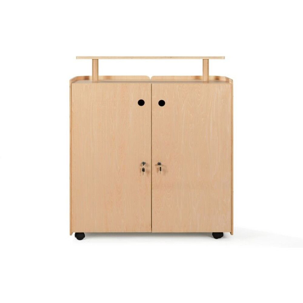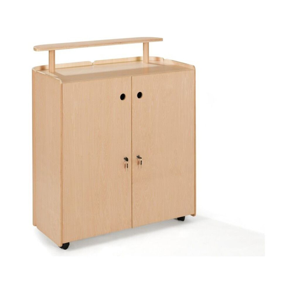 - Ausstattung: Erhöhte Ablagefläche, integrierte Regale, abschließbare Türen, 4 Lenkrollen (davon 2 gebremst)