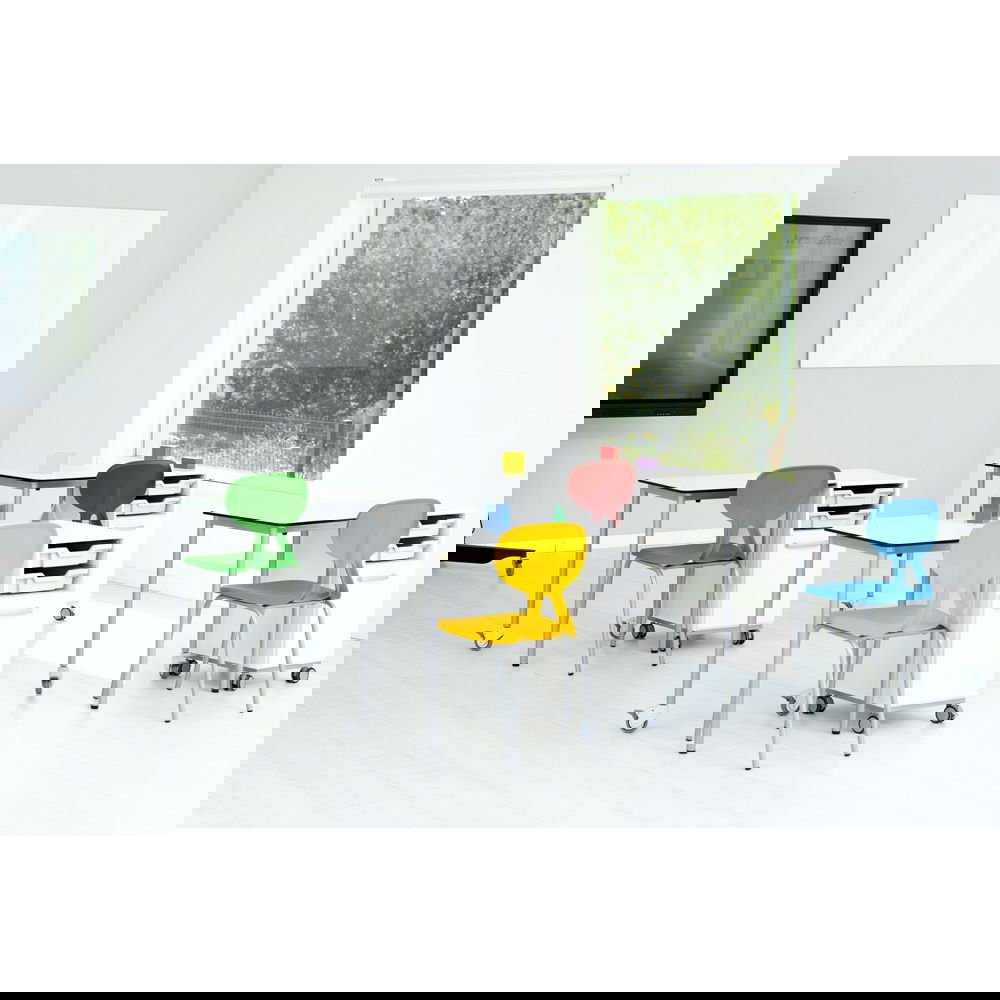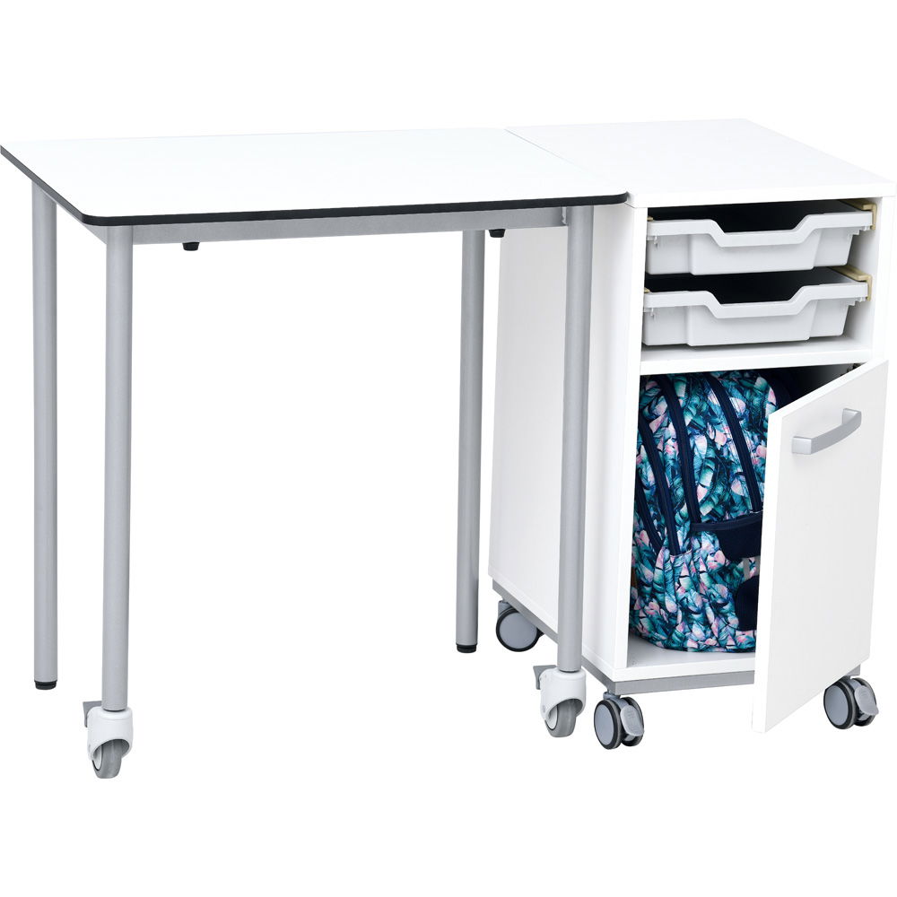 Das gesamte Set ist auf Rollen gelagert. Tisch und Schrank können mühelos als Einheit verschoben oder getrennt voneinander neu arrangiert werden. So passen Sie die Raumgestaltung in Sekundenschnelle an Einzel-, Partner- oder Gruppenarbeit an. - Extrem widerstandsfähige CDF-Tischplatte