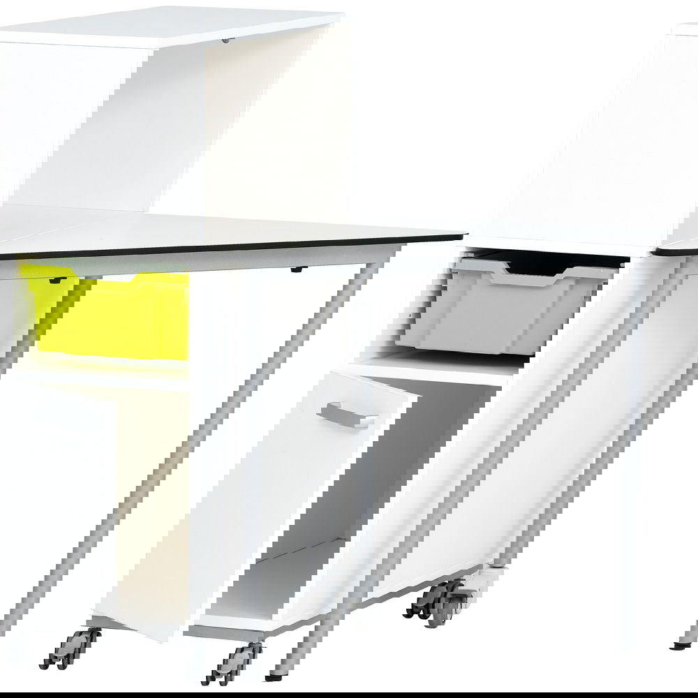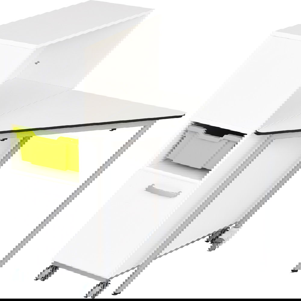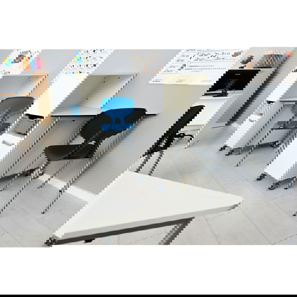 Die hochverdichtete CDF-Tischplatte ist für den anspruchsvollen Alltag in Schulen konzipiert. Sie ist kratzfest, stoßfest, feuchtigkeitsresistent und sogar schwer entflammbar – eine Investition, die sich auszahlt. - Integrierter Stauraum mit Sichtschutz