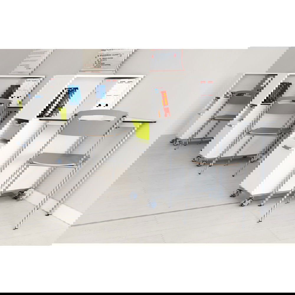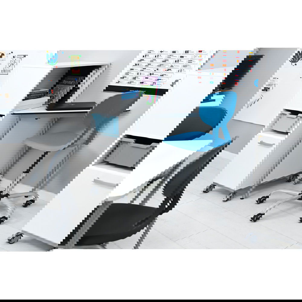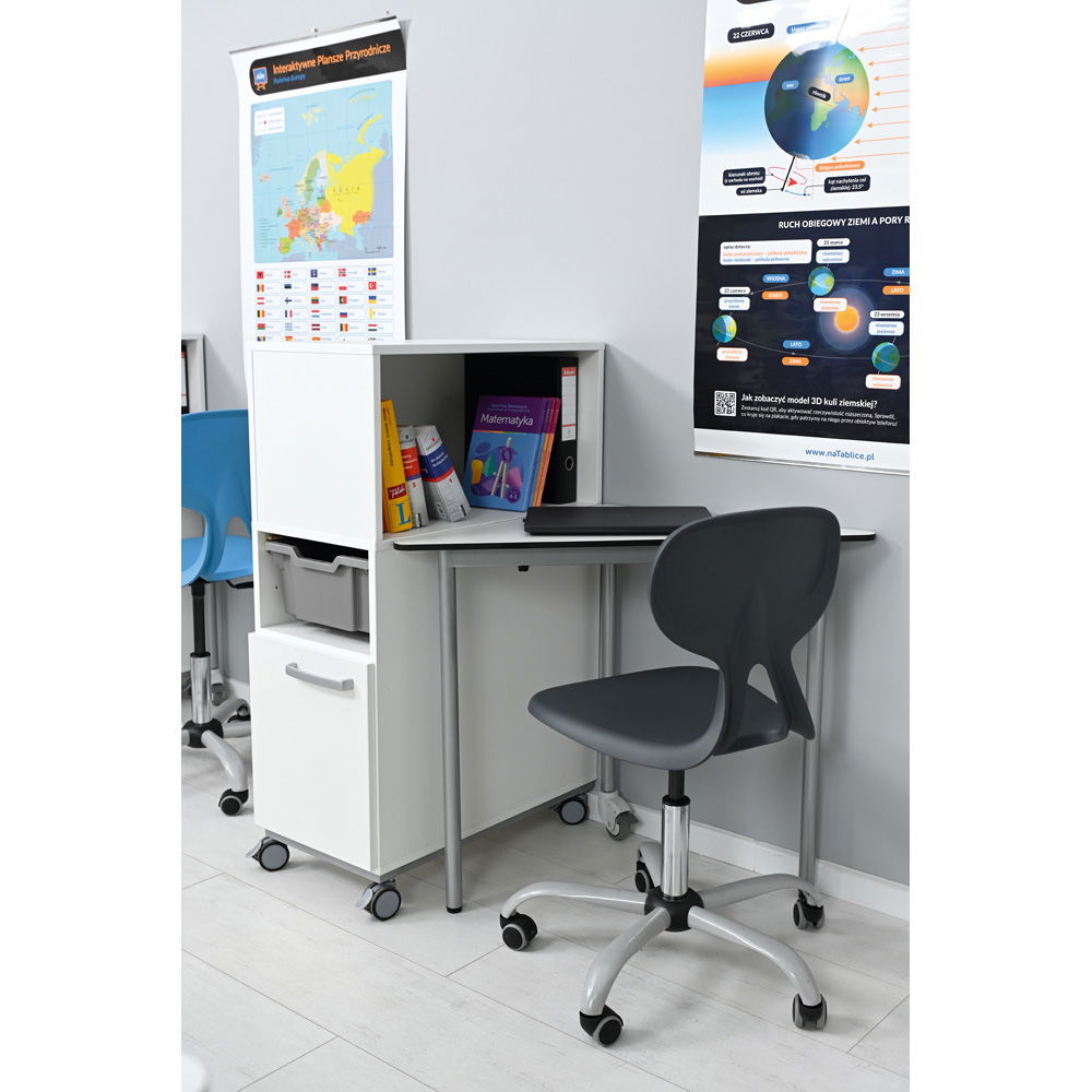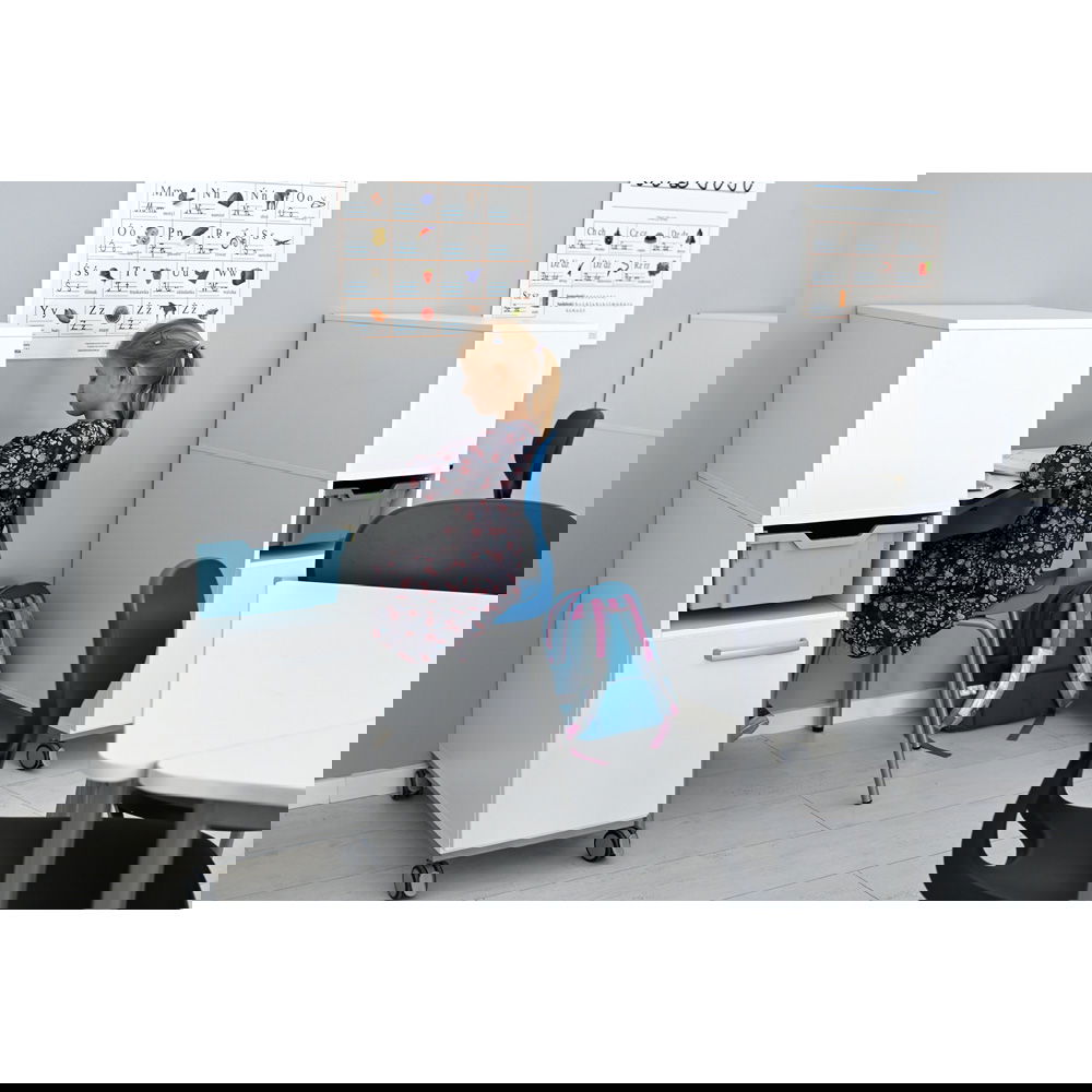 Der hohe Rollschrank bietet nicht nur Platz für die Schultasche, Ordner und Materialien, sondern schafft auch eine visuelle Barriere. Dies sorgt für mehr Privatsphäre und hilft, sich besser auf die eigene Aufgabe zu konzentrieren.