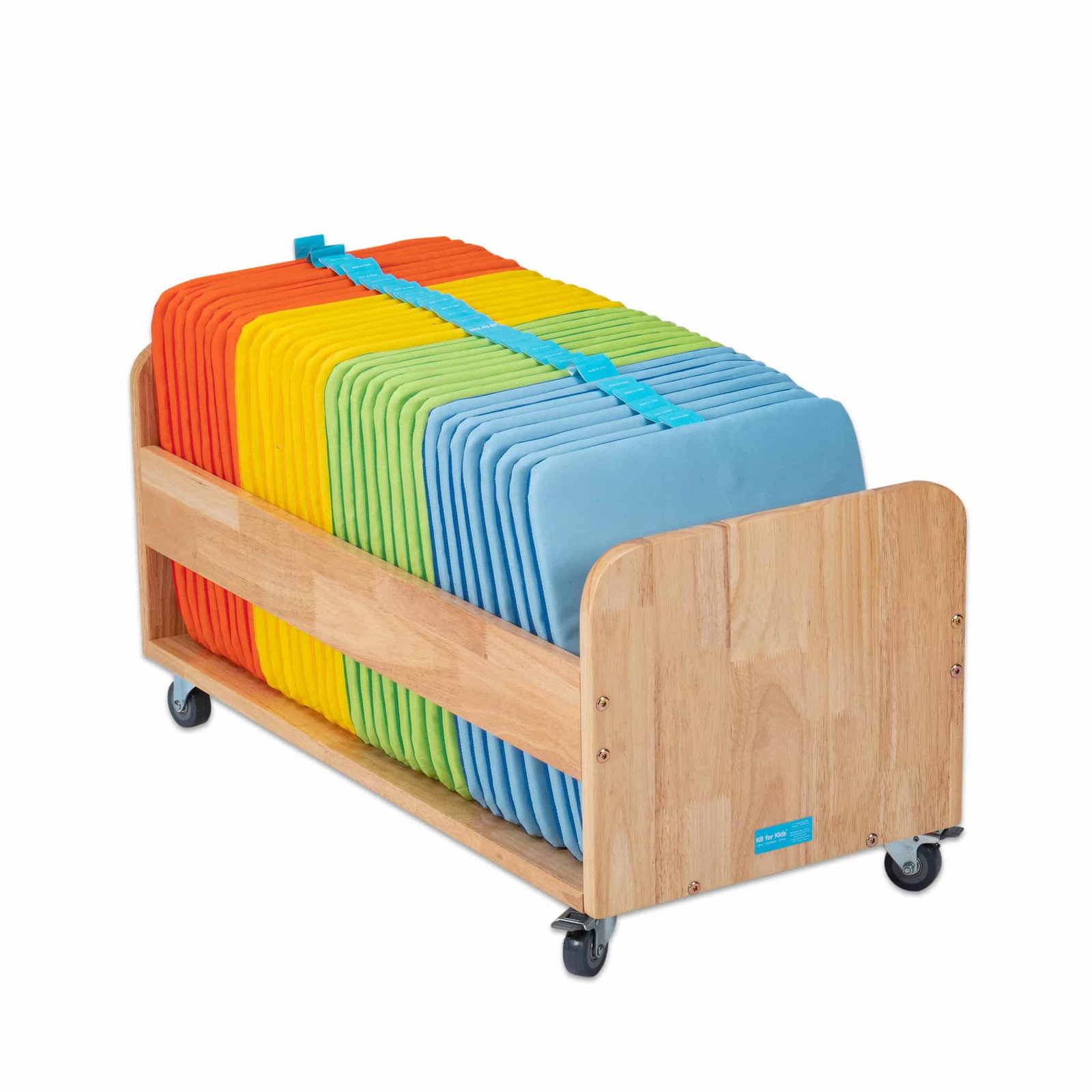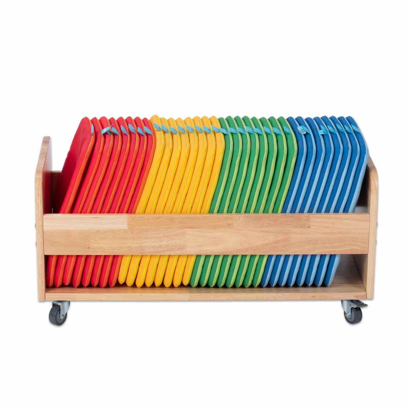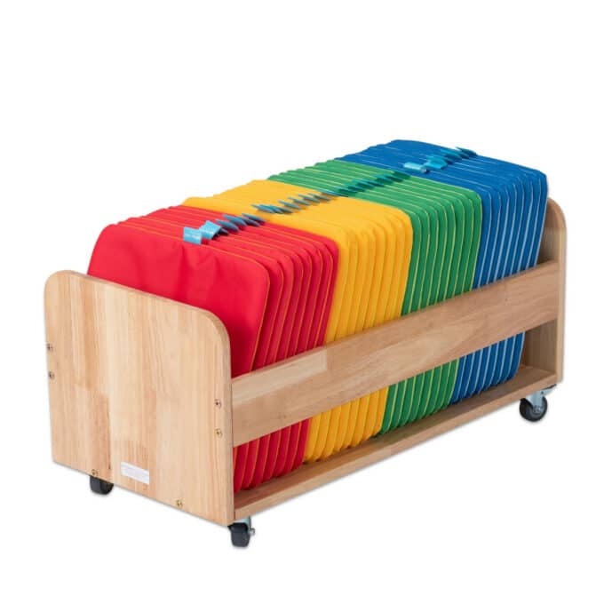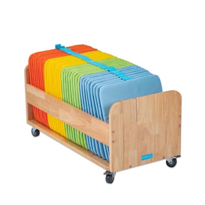 Mobiler Kissenwagen mit 32 waschbaren Sitzkissen. Perfekt für Sitzkreise in Kita & Schule. Fahrbarer Holzwagen für Ordnung & Flexibilität. Fördert Gemeinschaft.