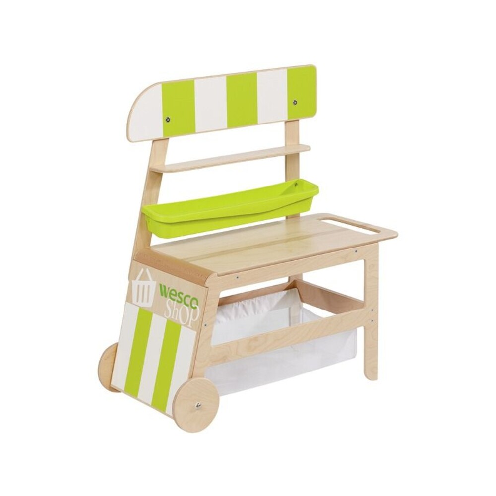 Platzmangel in Spielräumen stellt oft eine große Herausforderung dar. Aus diesem Grund haben wir diesen Kiosk besonders platzsparend konzipiert, ohne die nutzbare Spielfläche einzuschränken. Die Arbeitsplatte befindet sich auf einer ergonomischen und kindgerechten Höhe von 40 Zentimetern und bietet mehreren Kindern gleichzeitig ausreichend Raum für ein harmonisches Zusammenspiel. Dank der leichtgängigen Rollen und der seitlich angebrachten Griffe lässt sich der Marktstand mühelos bewegen. So bauen Sie die Spielecke genau dort auf, wo sie gerade gebraucht wird, und räumen sie später ebenso schnell wieder beiseite.