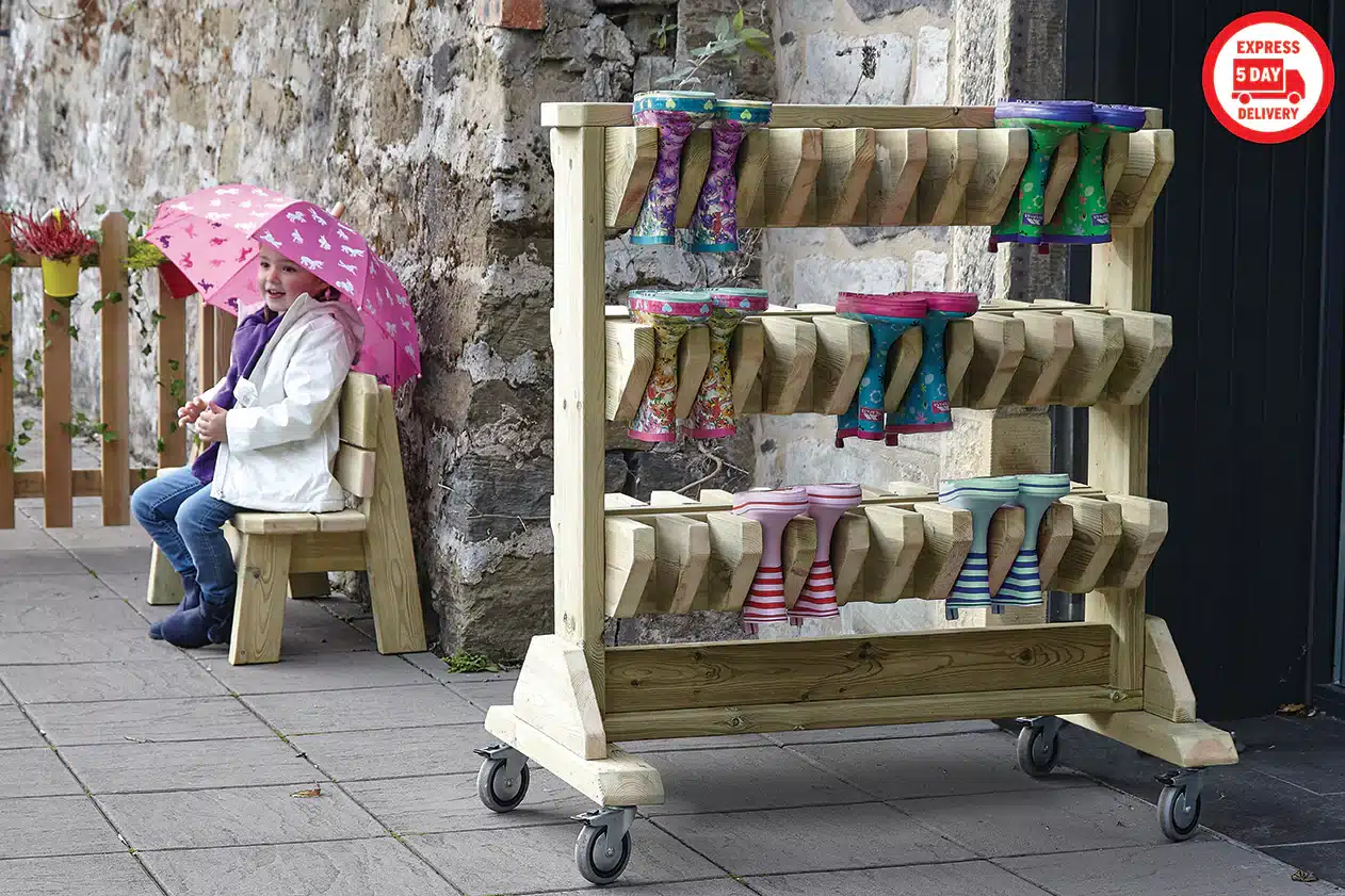 Mobiler Gummistiefelwagen aus Holz für 30 Paar Stiefel. Mit Rollen, beidseitig nutzbar. Fördert Ordnung & Selbstständigkeit. Wetterfest & 10 J. Garantie.