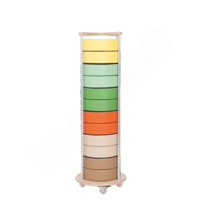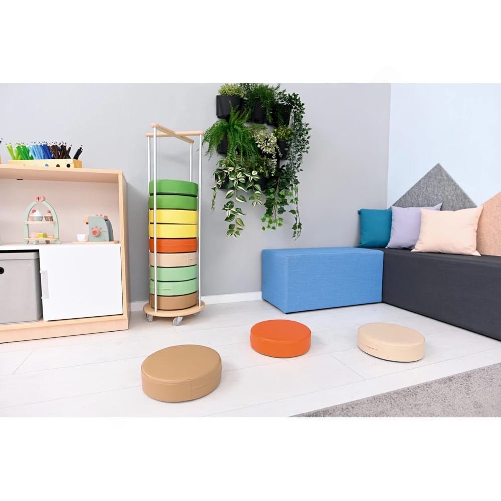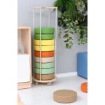 Entdecken Sie die perfekte Symbiose aus funktionalem Design und praktischer Effizienz mit dem Mobilen Ständer für runde Sitzkissen. Diese durchdachte Aufbewahrungslösung verwandelt jede Sammlung loser Bodenkissen in ein professionell organisiertes System und schafft gleichzeitig einen echten Blickfang in Ihren pädagogischen Räumen. Der elegante Turm aus hochwertiger Sperrholz-Aluminium-Konstruktion fasst bis zu 12 runde Sitzkissen mit 8 cm Stärke und nutzt dabei die vertikale Raumstruktur optimal aus. Mit seiner schlanken Grundfläche von nur 38 cm Durchmesser beansprucht er minimal Platz, während er gleichzeitig für perfekte Ordnung sorgt und die Lebensdauer Ihrer wertvollen Sitzkissen durch geschützte Lagerung deutlich verlängert. Die mobile Bauweise mit vier hochwertigen Rollen macht diesen Ständer zu einem flexiblen Organisationshelfer, der sich mühelos an veränderte Raumanforderungen anpasst.