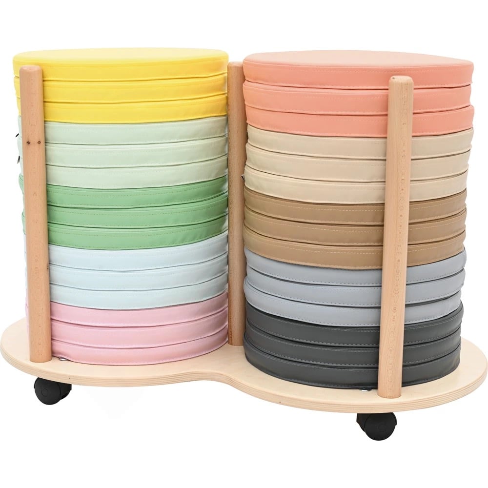 Der mobile Ständer mit 30 Bodenkissen ist die ideale Lösung für Räume, die flexible und platzsparende Sitzmöglichkeiten benötigen. Ob in Schulen, Kindergärten, Gemeinschaftsräumen oder bei Workshops – dieses praktische Set kombiniert Komfort, Mobilität und Ästhetik auf perfekte Weise. Der stabile Ständer aus hochwertig lackiertem Sperrholz ist mit robusten Rollen ausgestattet, die ein einfaches Verschieben und flexibles Umstellen ermöglichen. Die 30 bequemen Bodenkissen sind in vielfältigen, harmonischen Farben wie Pastellgelb, Pastellblau, Pastellrosa, Lachsfarben oder Olivgrün gestaltet und fügen sich nahtlos in jede Umgebung ein.