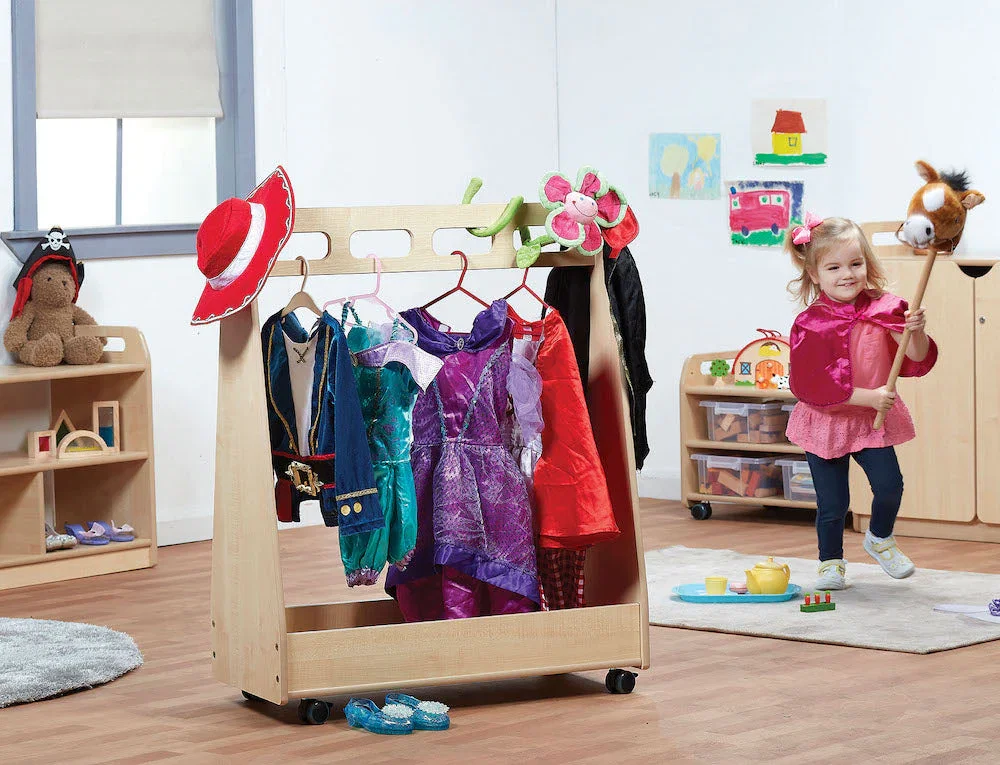 Bereichern Sie Ihre frühpädagogische Einrichtung mit diesem funktionalen Möbelstück. Der mobile Verkleidungswagen verbindet spielerisches Lernen mit praktischem Nutzen und wird schnell zum Herzstück Ihres Rollenspielbereichs.
