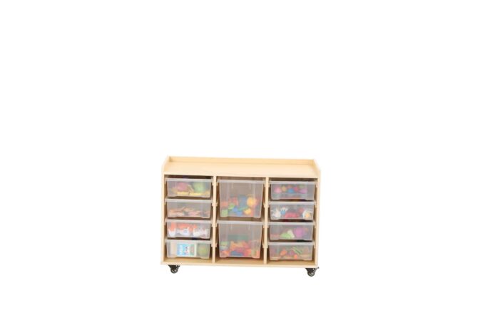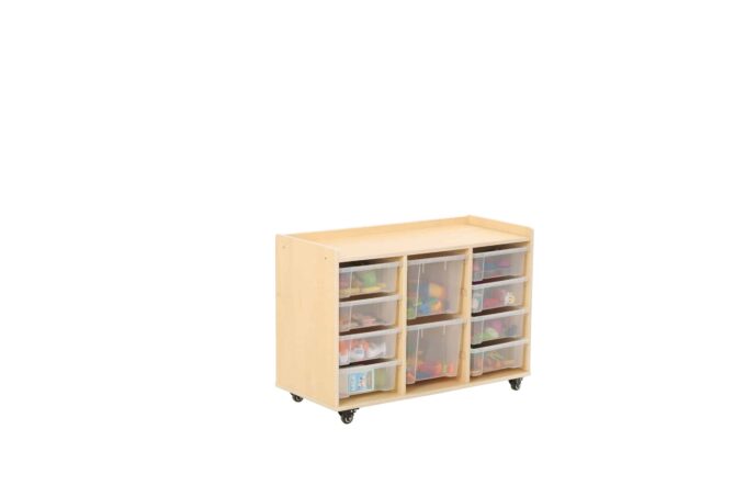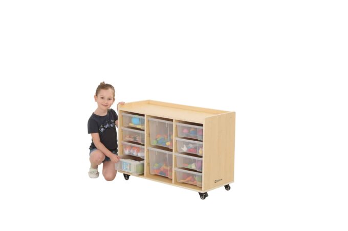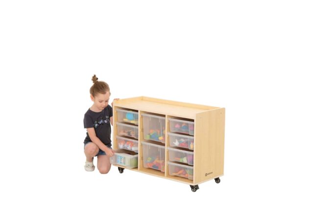 - Kompakte und übersichtliche Aufbewahrung: Drei Reihen mit unterschiedlich großen Boxen bieten optimalen Stauraum für verschiedenes Spiel- und Lernmaterial.