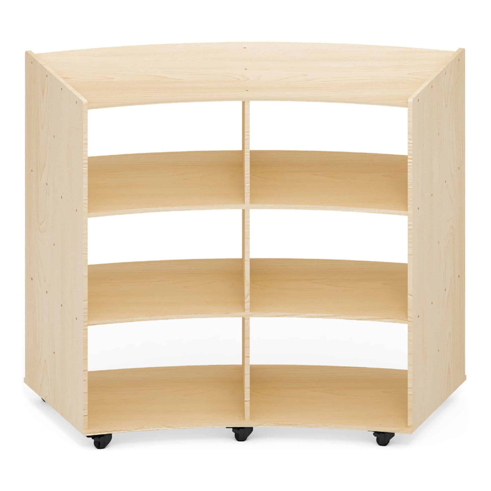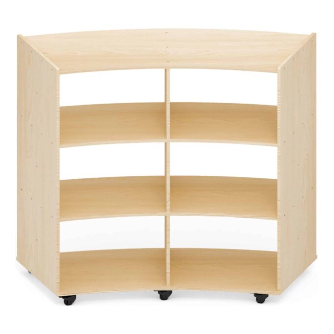 Hergestellt aus Pappel-Multiplex mit einer strapazierfähigen Melaminbeschichtung in stilvoller Ahorn-Optik, bietet das Viertelkreis-Regal sowohl ästhetische Anziehungskraft als auch langfristige Stabilität. Die Rollen aus Stahl mit Gummi-Bereifung ermöglichen ein sanftes Bewegen des Regals, sodass Sie den Raum je nach Bedarf flexibly gestalten können. Dies ist besonders praktisch für Gruppenaktivitäten, bei denen oft der Platz gewechselt wird.