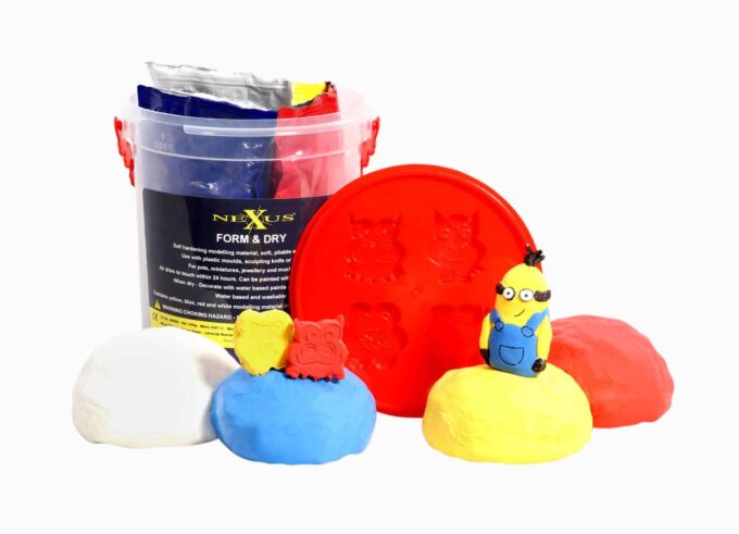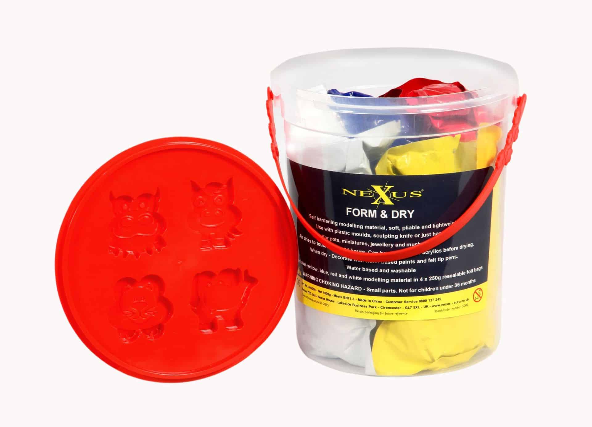 Die Modellierknete Form & Dry wird im Eimer geliefert und besteht aus vier Farben. Aus der Knete können verschiedene Modelle/Motive gebastelt werden, die innerhalb von 24 Stunden trocknen.