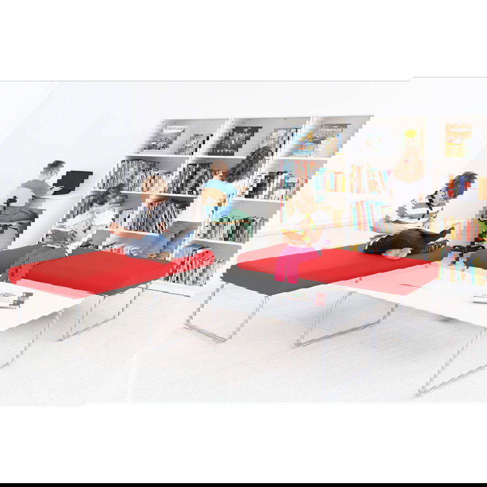 - Hohe Langlebigkeit: Der robuste Textilbezug und das stabile Metallgestell halten der intensiven Nutzung im öffentlichen Raum dauerhaft stand.