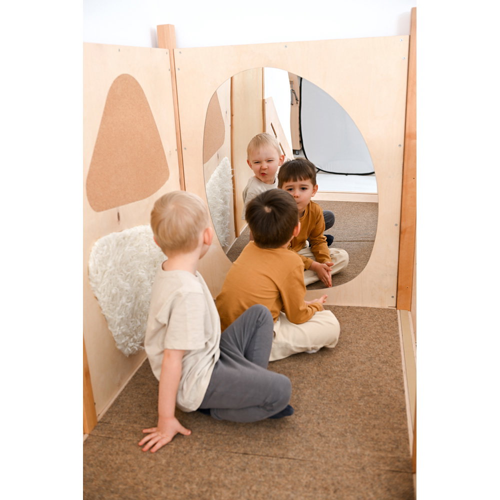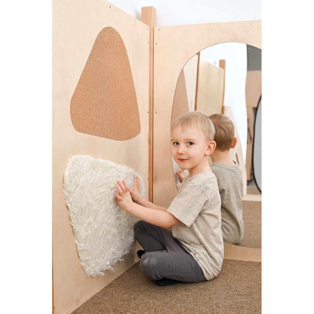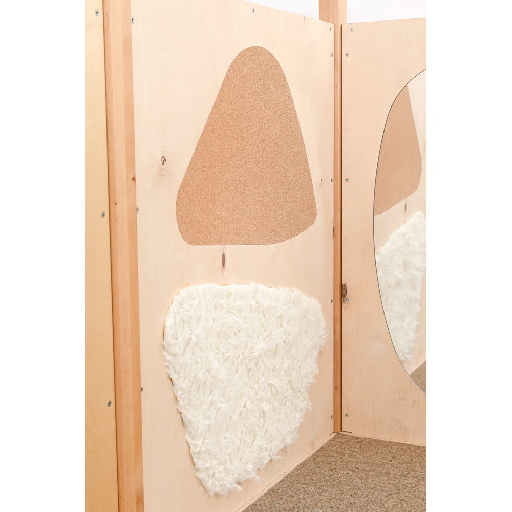 Das Besondere an diesem Set ist die Vielfalt der integrierten Spiel- und Wandelemente. Eine Wand mit Sensorikelementen weckt die Neugier und lädt zum Fühlen und Ausprobieren ein. Eine weitere Wand mit einem integrierten Spiegel fördert die Selbstwahrnehmung der Kinder. Ein charmantes Bogenfenster aus bruchsicherem Acrylglas und eine durchbrochene Wand schaffen spannende Ausblicke und Versteckmöglichkeiten. Alle Elemente sind so konzipiert, dass sie sicher und einfach von zwei Personen aufgebaut werden können. Die Konstruktion muss abschließend entweder am Boden befestigt oder mittels Montageband an der Wand fixiert werden, um maximale Sicherheit zu gewährleisten.