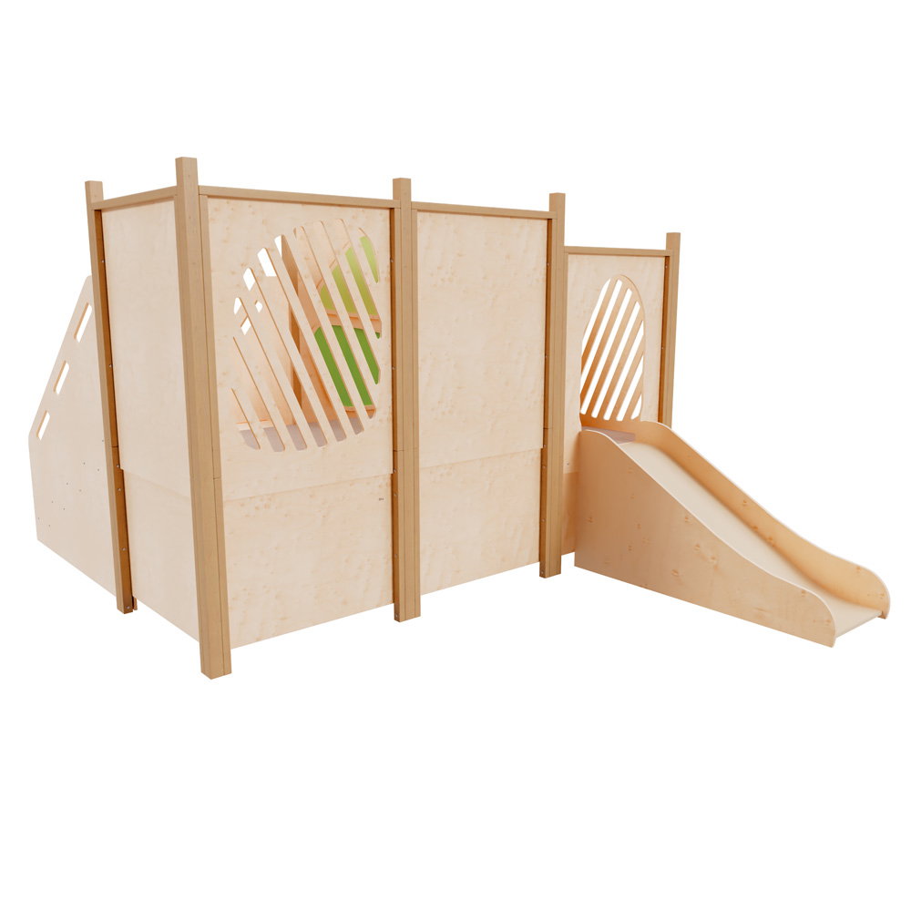 Abwechslungsreiche Elemente wie die Rutsche, Sensorik- und Spiegelwände schulen den Gleichgewichtssinn, die Feinmotorik und die Wahrnehmung der Kinder auf spielerische Weise.