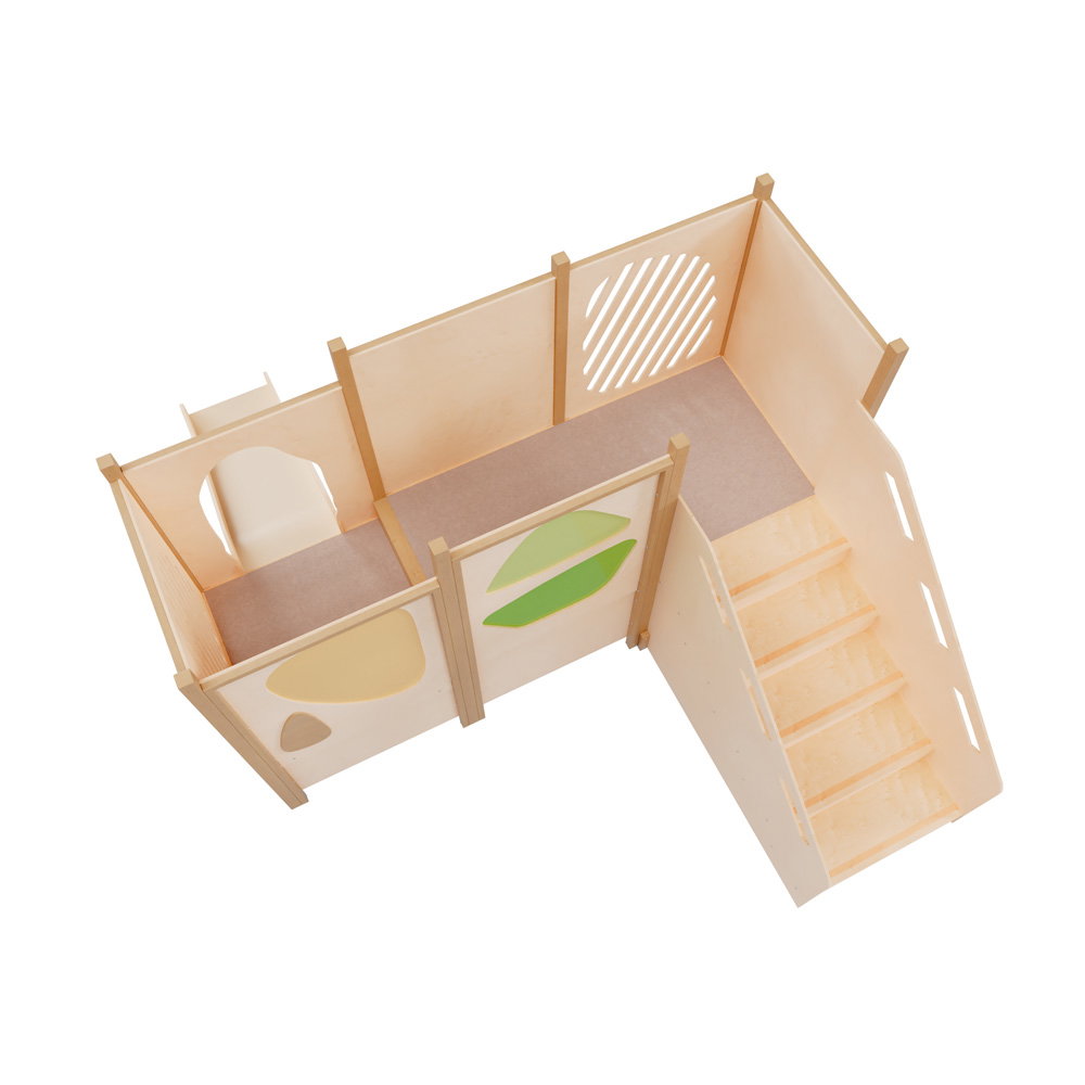 Ein besonderes Highlight des ModuPlay Sets 2 ist die Vielfalt der integrierten Erlebnisstationen. Eine Treppe führt die kleinen Entdecker sicher nach oben, während eine Rutsche mit kratzfester HPL-Beschichtung für rasanten Spaß sorgt. Ergänzt wird das Klettererlebnis durch pädagogisch wertvolle Wandelemente: Eine Sensorikwand lädt zum Fühlen und Ausprobieren ein, eine Spiegelwand fördert die Selbstwahrnehmung, und ein Bogenfenster aus bruchsicherem Acrylglas eröffnet spannende Ausblicke. Der Aufbau gestaltet sich dabei äußerst einfach und kann problemlos von zwei Personen durchgeführt werden. Für maximale Sicherheit wird die Spielecke wahlweise fest im Boden verankert oder sicher an der Wand fixiert.