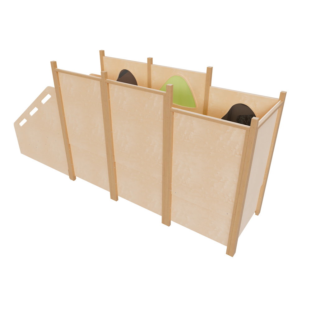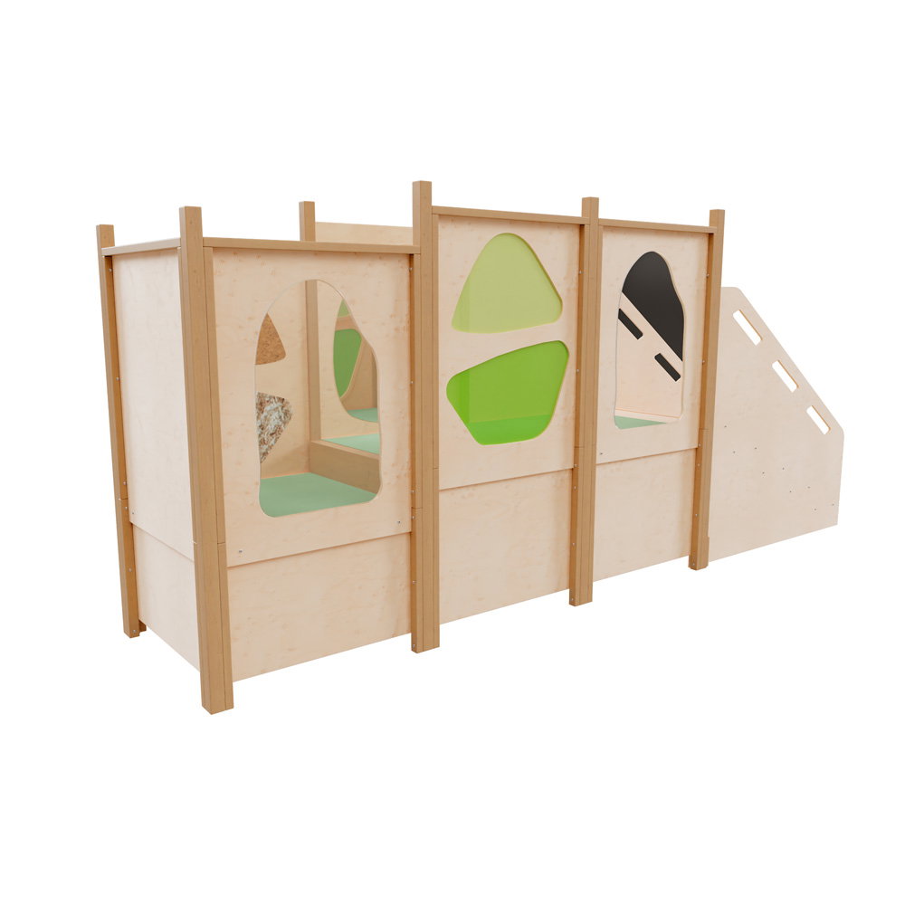 Das Set 4 zeichnet sich besonders durch seine vielfältigen und interaktiven Wandelemente aus, die die Sinne der Kinder gezielt ansprechen. Über eine sichere Treppe gelangen die kleinen Entdecker auf die Plattformen. Dort erwarten sie spannende Stationen: Eine Sensorikwand lädt zum Fühlen und Ausprobieren ein, während gleich zwei Spiegelwände die visuelle Wahrnehmung und das Selbsterkennen fördern. Zwei Wände mit farblosen Bogenfenstern sowie eine Wand mit zwei grünen Fenstern aus bruchsicherem Acrylglas eröffnen spannende Blickwinkel und eignen sich perfekt für kommunikative Rollenspiele. Der Aufbau gestaltet sich dank des cleveren Systems äußerst unkompliziert und kann bequem von zwei Personen durchgeführt werden. Für die nötige Stabilität muss die Anlage wahlweise fest im Boden verankert oder sicher an der Wand fixiert werden.