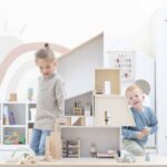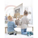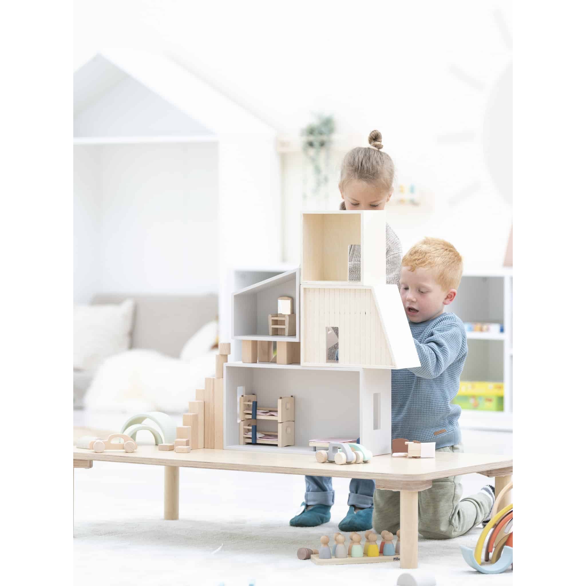 Das Puppenhaus überzeugt durch seine moderne, schlichte Ästhetik und die Verwendung von hellen Farben. Die teilweise asymmetrischen Wände und die geriffelte Holzrückwand machen das Spielhaus zu einem echten Hingucker und unterstützen die Neugier der Kinder. Die Kombination aus warmem Grau und natürlichem Holz schafft eine ansprechende, ruhige Atmosphäre, in der Kinder kreativ spielen können.