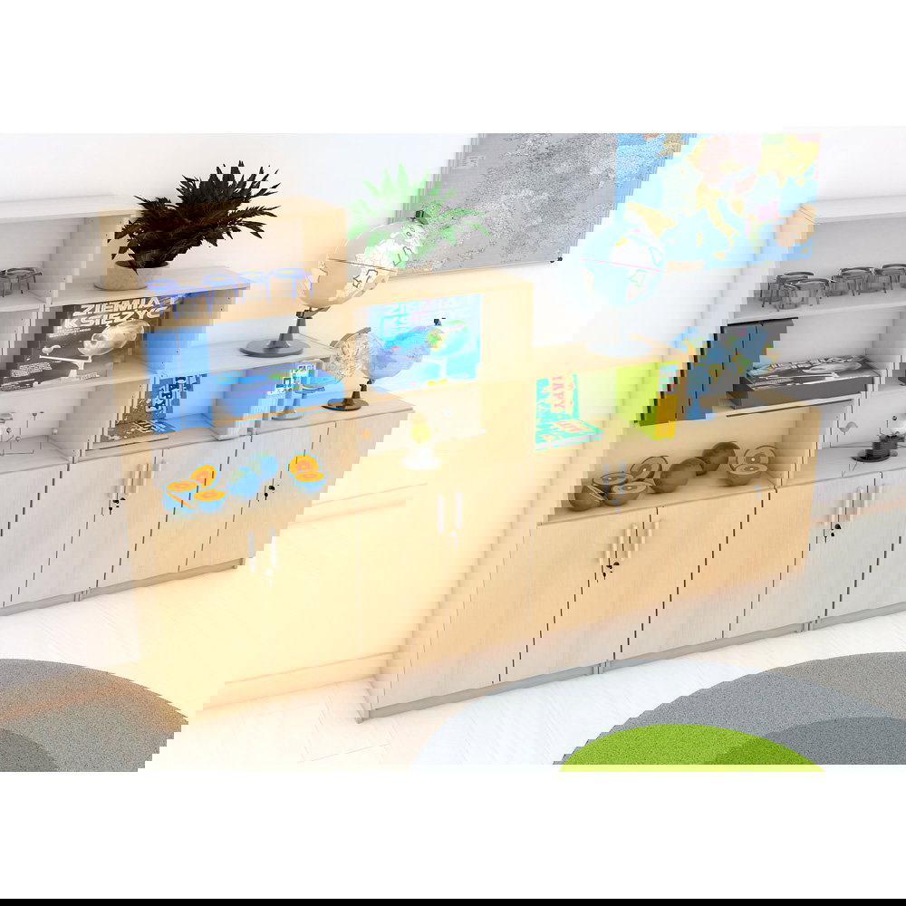 Dieses Set wurde sorgfältig zusammengestellt, um auf einer Gesamtbreite von über drei Metern maximale Funktionalität zu bieten. Es kombiniert drei verschieden hohe Kombi-Regale mit einem praktischen, niedrigen Schrank. Jedes Kombi-Regal bietet eine smarte Mischung aus offenem Präsentationsraum und geschlossenem, sicherem Stauraum. Die abfallende Linie sorgt nicht nur für ein spannendes Design, sondern schafft auch nützliche Ablageflächen auf den Oberseiten der niedrigeren Elemente. Erhältlich in den warmen und einladenden Dekoren Ahorn und Buche, bringt der Möbelsatz EXPO 3 Bewegung und Eleganz in jeden Raum.