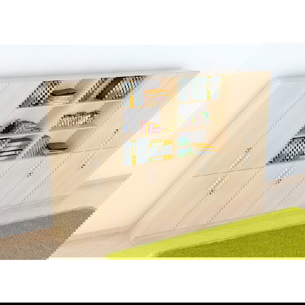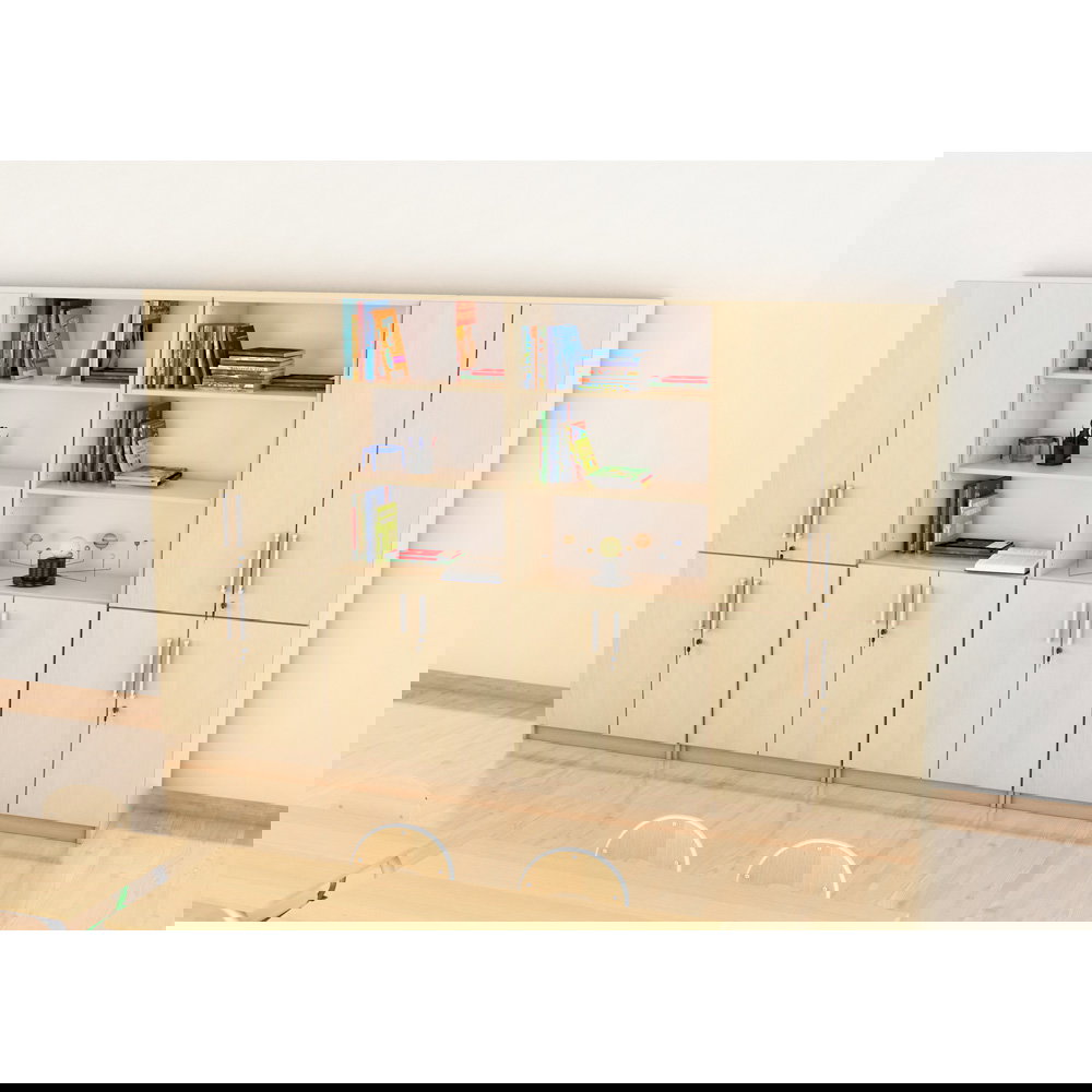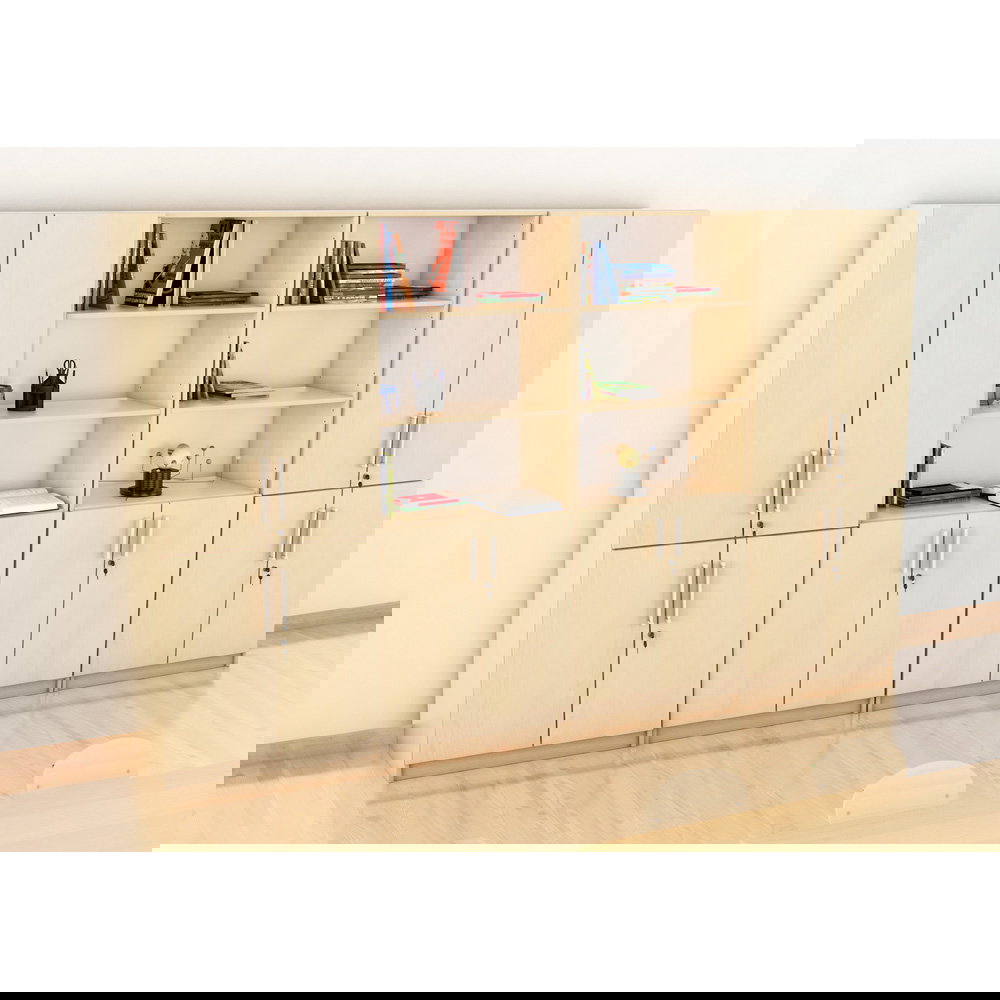 Das Set kombiniert geschickt geschlossenen und offenen Stauraum: Zwei viertürige Schränke sorgen für Diskretion und Sicherheit bei vertraulichen Unterlagen, während zwei Kombi-Regale mit Schrankunterbau schnellen Zugriff und Präsentationsfläche bieten. Diese Mischung lockert die große Schrankwand optisch auf und verhindert, dass der Raum „erdrückt“ wirkt. Erhältlich in den klassischen, freundlichen Dekoren Ahorn und Buche, strahlt der Möbelsatz EXPO 8 eine zeitlose Eleganz aus, die sich harmonisch in bestehende Raumkonzepte einfügt.