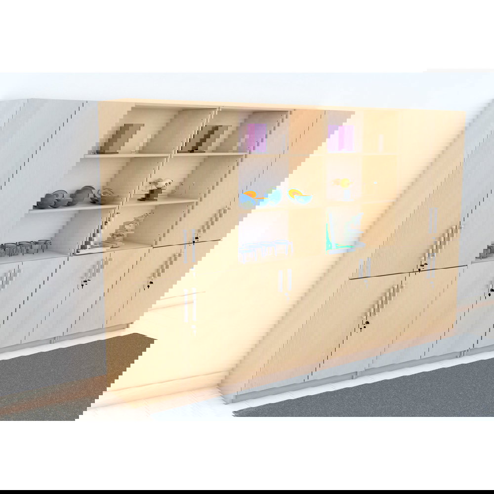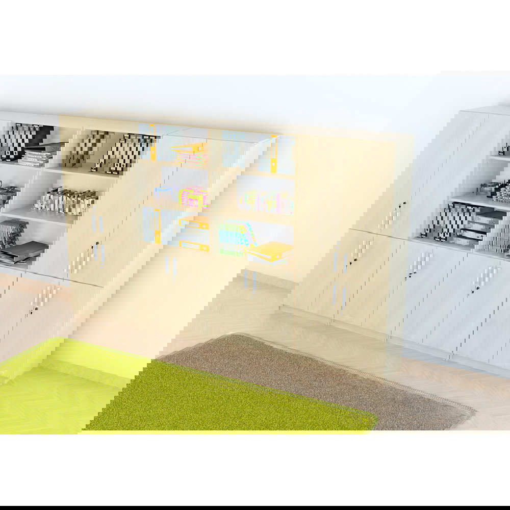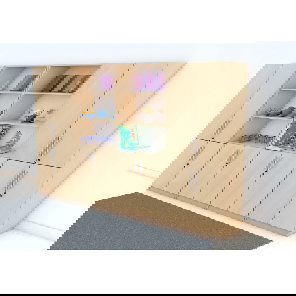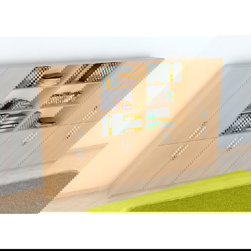 Das Set kombiniert geschickt geschlossenen und offenen Stauraum: Zwei viertürige Schränke sorgen für Diskretion und Sicherheit bei vertraulichen Unterlagen, während zwei Kombi-Regale mit Schrankunterbau schnellen Zugriff und Präsentationsfläche bieten. Diese Mischung lockert die große Schrankwand optisch auf und verhindert, dass der Raum „erdrückt“ wirkt. Erhältlich in den klassischen, freundlichen Dekoren Ahorn und Buche, strahlt der Möbelsatz EXPO 8 eine zeitlose Eleganz aus, die sich harmonisch in bestehende Raumkonzepte einfügt.