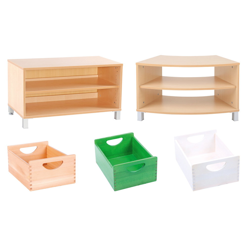 Mit 24 robusten Holzbehältern in drei verschiedenen Farben wird das Sortieren und Aufräumen zum Kinderspiel. Die niedrige Höhe der Möbel ermöglicht es selbst den Jüngsten, Spielsachen und Materialien eigenständig zu erreichen und wieder wegzuräumen. - Flexibel und offen gestaltet