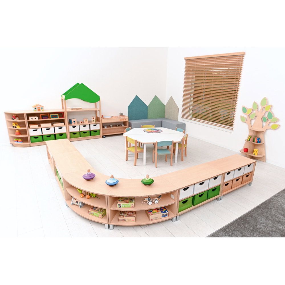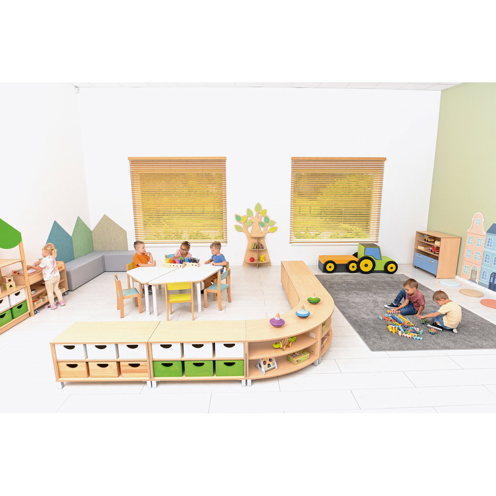 Stellen Sie sich eine lebendige Ecke im Gruppenraum vor, die klar definiert ist, ohne einzuengen. Hier können Kinder auf dem Boden spielen, bauen und lernen, umgeben von Möbeln, die Stauraum und Ablagefläche in perfekter Reichweite bieten. Die Kombination aus geraden und geschwungenen Schränken schafft eine dynamische Form, die alles andere als starr wirkt. Mit insgesamt 24 Holzbehältern in den Farben Weiß, Grün und Buche-Natur wird das Aufräumen selbst zum Spiel. Jedes Ding findet seinen Platz, und die Kinder lernen spielerisch, Verantwortung für ihre Umgebung zu übernehmen. Das helle Birke-Dekor der Möbel sorgt dabei für eine warme, freundliche Atmosphäre.