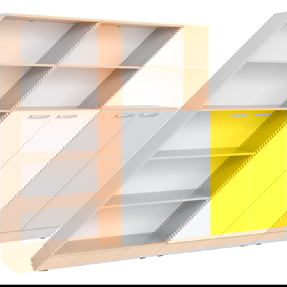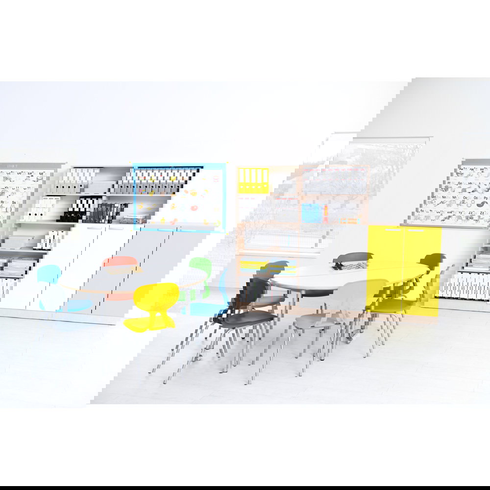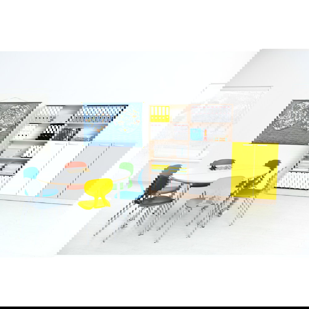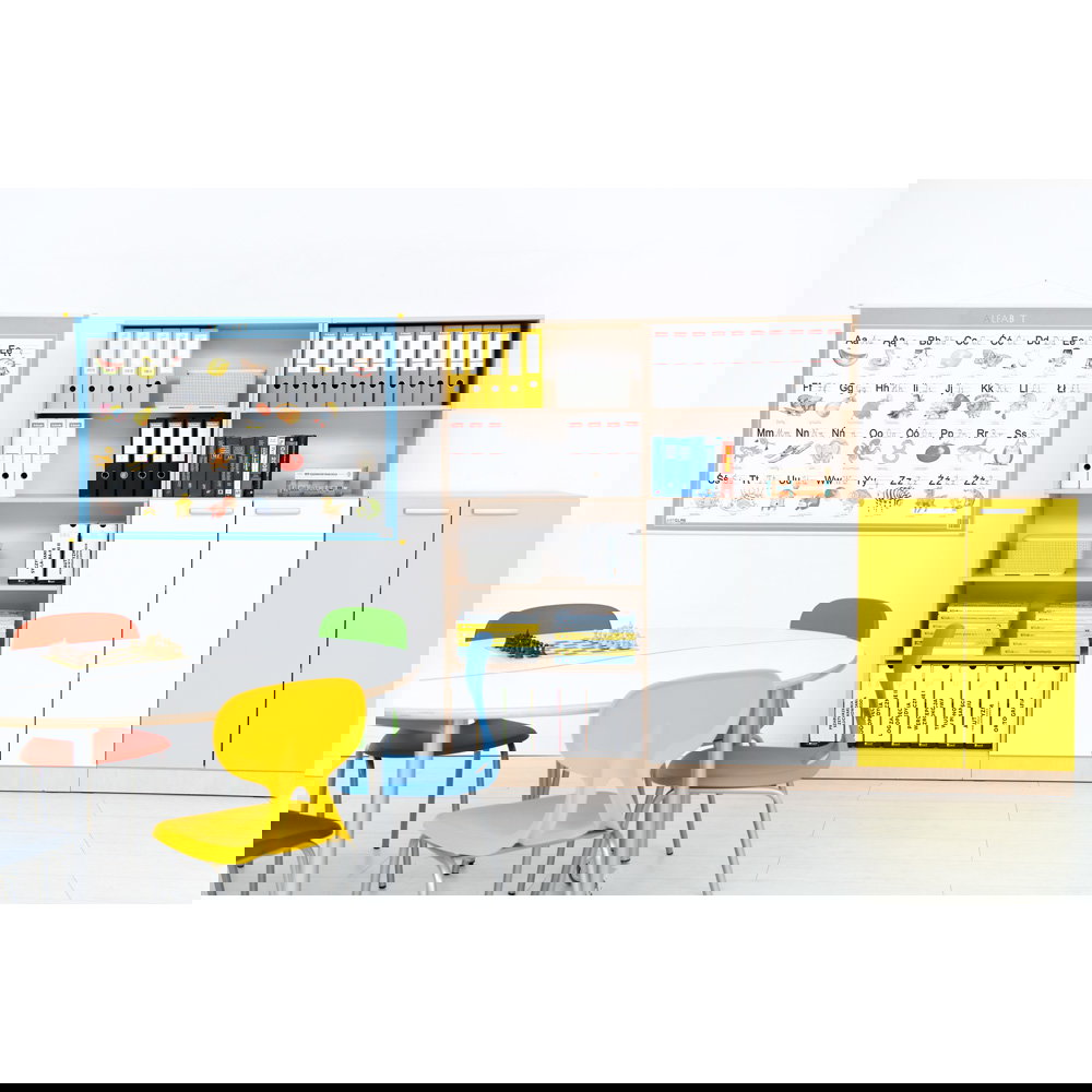 Dieses Möbel-Set ist ideal für Räume, die Kreativität und Ordnung gleichermaßen fördern sollen – sei es im modernen Klassenzimmer, im Kindergarten, in der Bibliothek oder im kreativen Büro. Die Konstruktion spielt gekonnt mit Höhenunterschieden: Zwei hohe Schranktürme flankieren ein niedrigeres Mittelelement, was die sonst oft strenge Optik von Schrankwänden auflockert. Mit einer platzsparenden Tiefe von nur 38 cm (T 38 Serie) fügt sich der Möbelsatz auch in schmalere Räume ein, ohne den Durchgang zu blockieren, bietet aber dennoch überraschend viel Platz für Bücher, Ordner und Materialien.