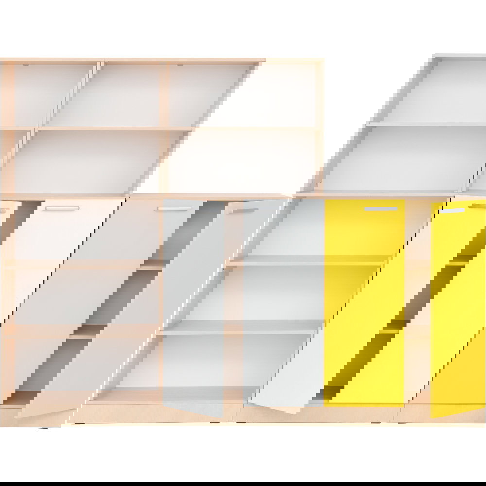 - Links & Rechts: Je ein hoher Schrankturm (Schrank L + Aufsatz M). Einer davon mit Türen (Gelb oder Weiß, je nach Montage), einer offen.